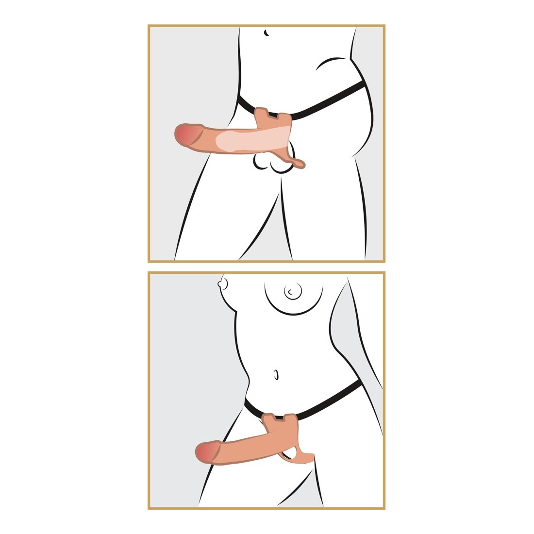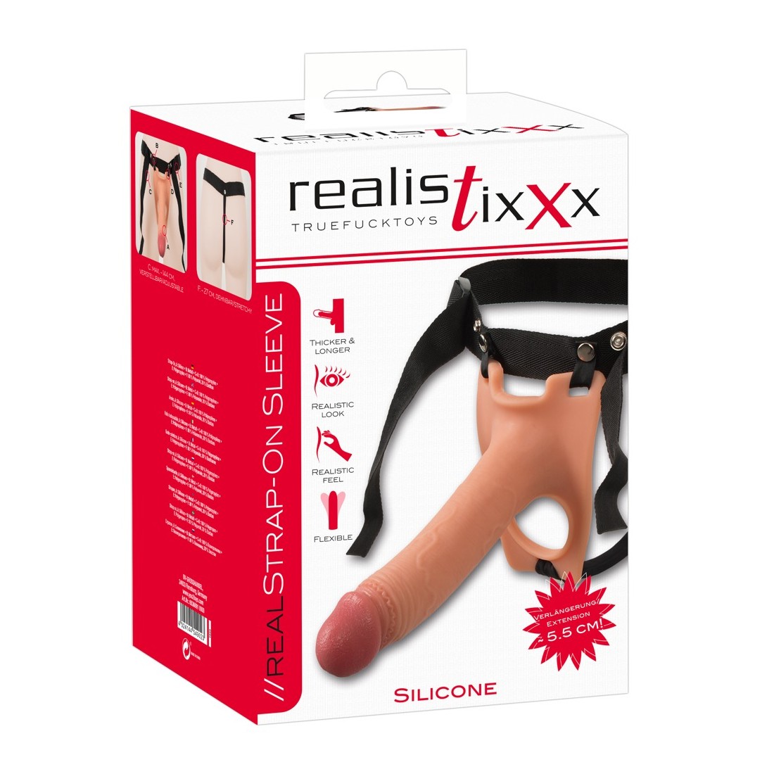 Con questo strap-on sleeve di Realistixxx, il pene ottiene una favolosa estensione di 5,5 cm e un notevole ispessimento di 1,4 cm. Realizzato in silicone liquido ultra-morbido, il manicotto è estremamente realistico e sembra particolarmente attraente con il suo glande rosa e le sue leggere venature. Il foro per i testicoli, nel frattempo, dà alla manica una presa migliore e invita il partner di gioco a prestare un po' di attenzione anche ai testicoli. La cintura in vita è regolabile in larghezza e rimovibile. Una fascia tra i glutei dà un sostegno supplementare, è particolarmente elastica e anche rimovibile. Perfetto per tutti coloro che amano avere un po' di più!