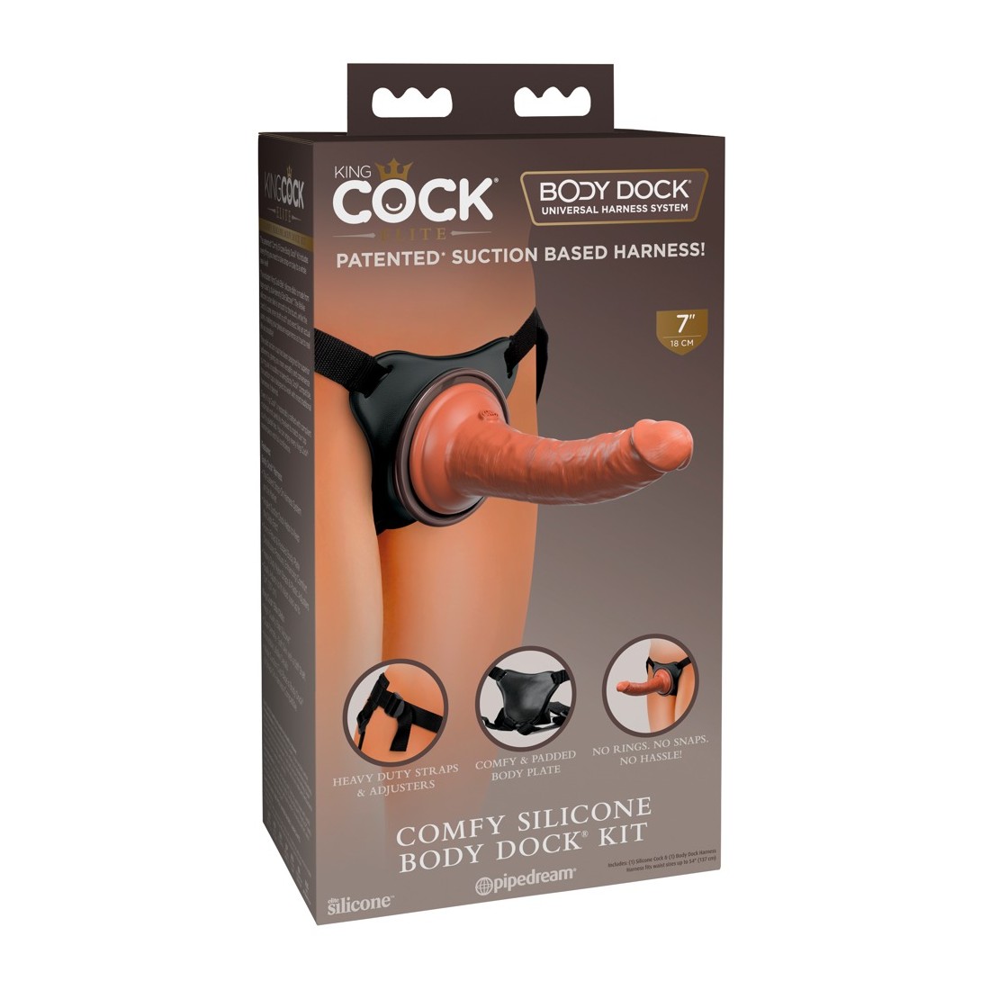 Il Comfy Silicone Body Dock Kit di King Cock Elite include il comodo strap-on Comfy Body Dock e il dildo molto realistico da 7" Dual Density Silicone Cock natural per un divertimento illimitato di pegging e i sogni di spinta lesbica diventano realtà.