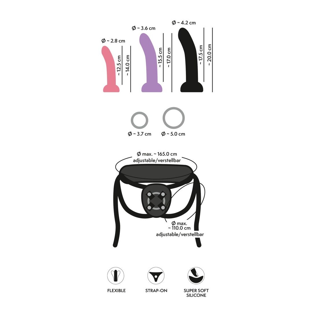 set strap-on da 4 pezzi della Your Strap-on Collection di You2Toys con imbracatura e 3 dildo di dimensioni diverse (S, M, L). Ogni dildo a ventosa può essere inserito rapidamente e facilmente nell'imbracatura strap-on regolabile e sostituito. E naturalmente può essere usato anche da solo. Un set vario per un divertimento versatile - da soli e in coppia!