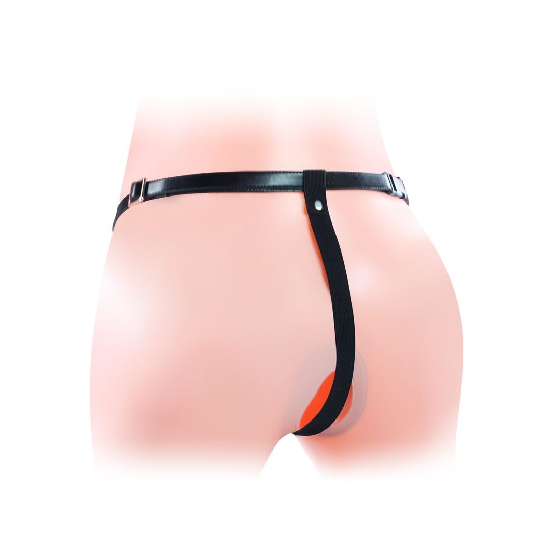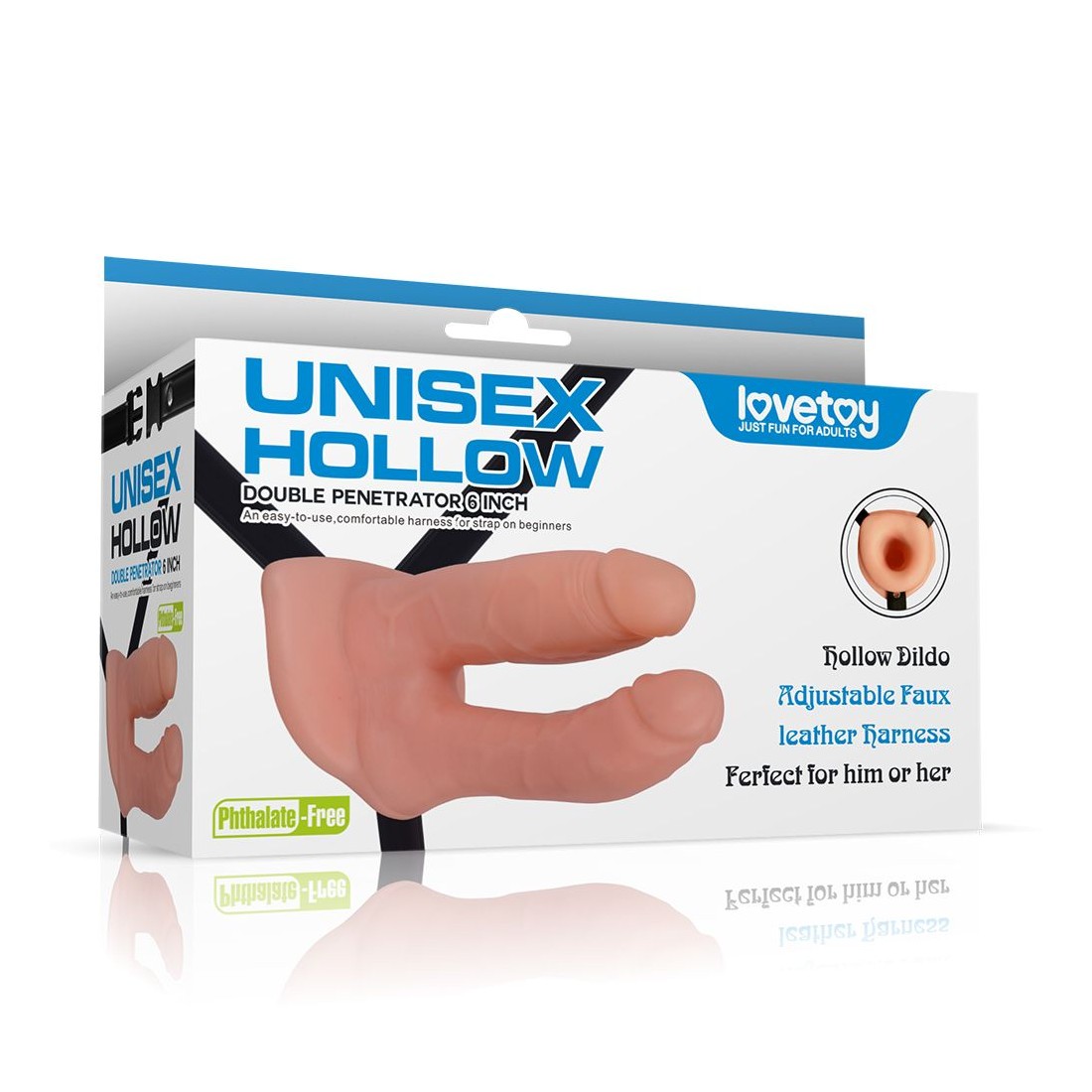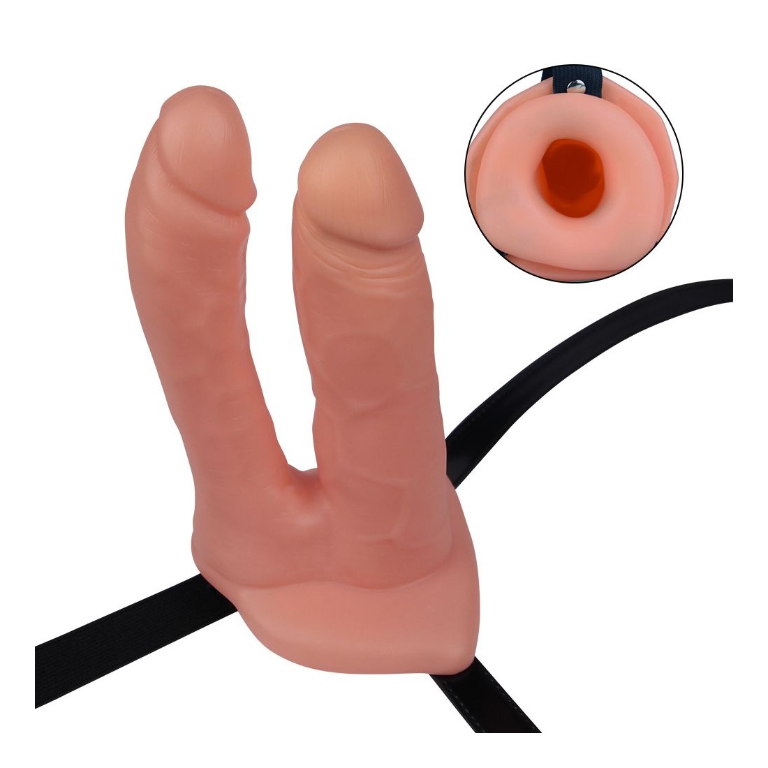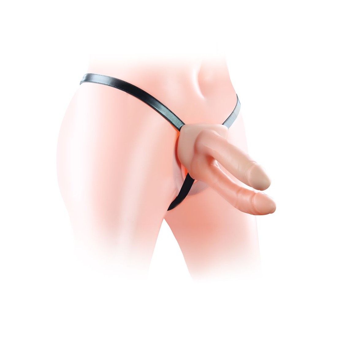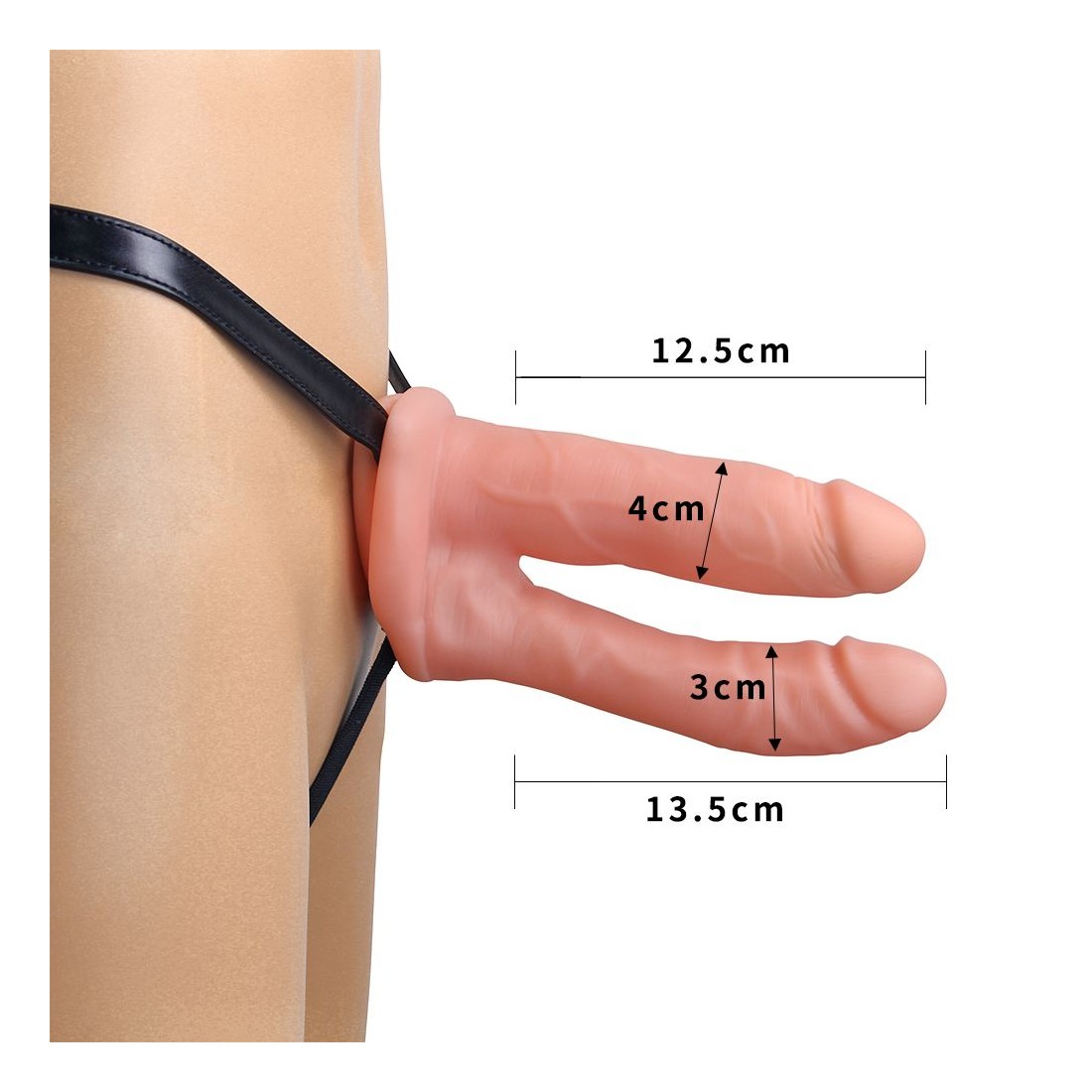 Double Hollow è uno strap on composto da un doppio fallo, indossabile ed ideale per sperimentare nuovi giochi erotici col partner. Il toy ha fattezze realistiche con glandi e venature definite nei dettagli. Il fusto principale è più corposo e cavo, adatto per essere usato sia dalla donna che dall’uomo e per un'intensa penetrazione vaginale. Il secondo fusto è più lungo e leggermente curvo, ideale per la penetrazione anale. Realizzato in Pvc di alta qualità, il toy è privo di ftalati e di latex ed è totalmente waterproof, per piacevoli stimolazioni anche in acqua. L’imbracatura è facilmente regolabile con una misura che varia tra 63.5 e 101.5 cm. La lunghezza di penetrazione è di 12,7 cm mentre il diametro misura 4 cm.