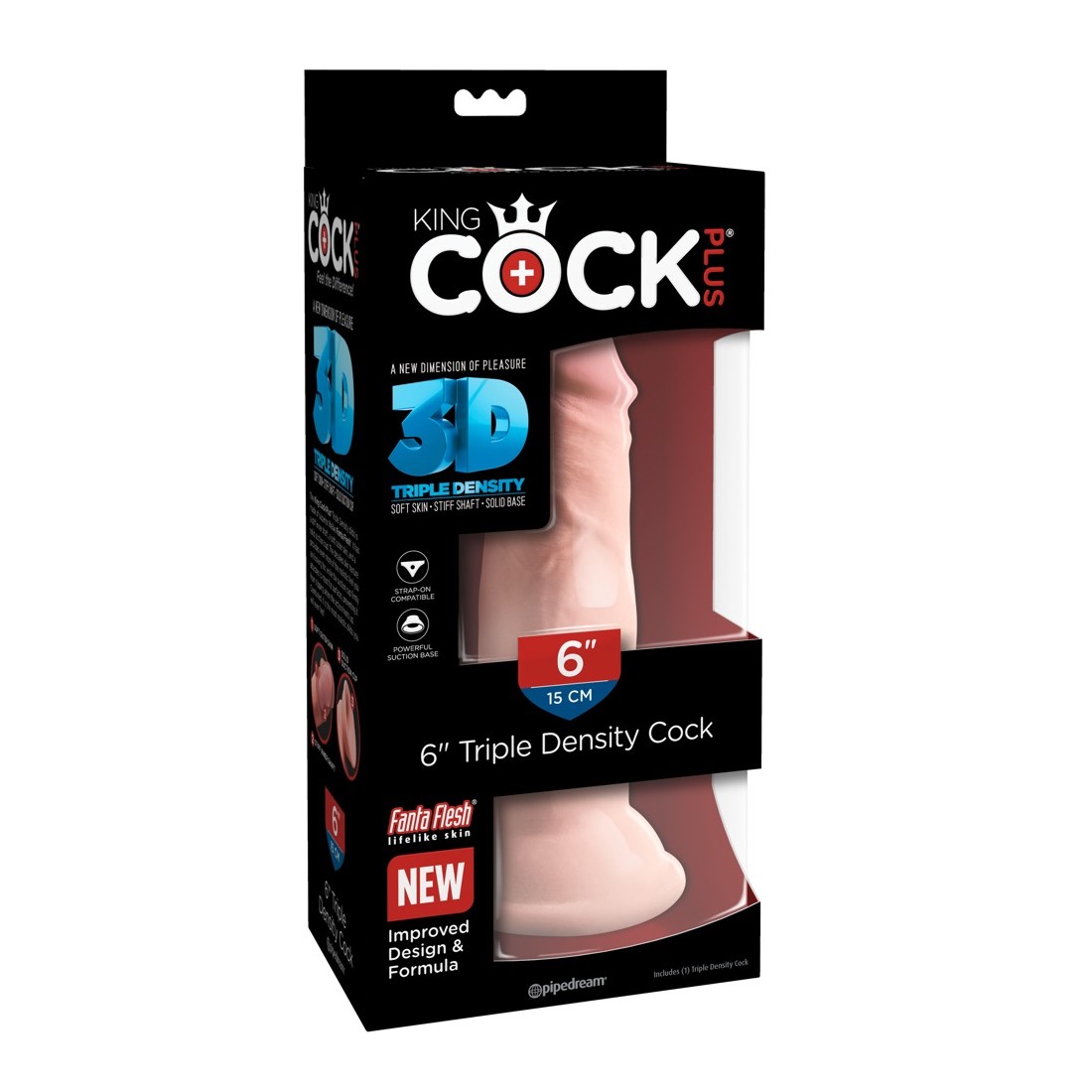 Questo dildo realistico da 6" Triple Density Cock di King Cock Plus ha un nucleo duro e una superficie particolarmente morbida. Così ci si sente proprio come l'originale. La superficie è disegnata in modo realistico con un glande pronunciato e delle venature. Il buon pezzo è compatibile con gli strap-on e ha una pratica base a ventosa per giri a mani libere.
