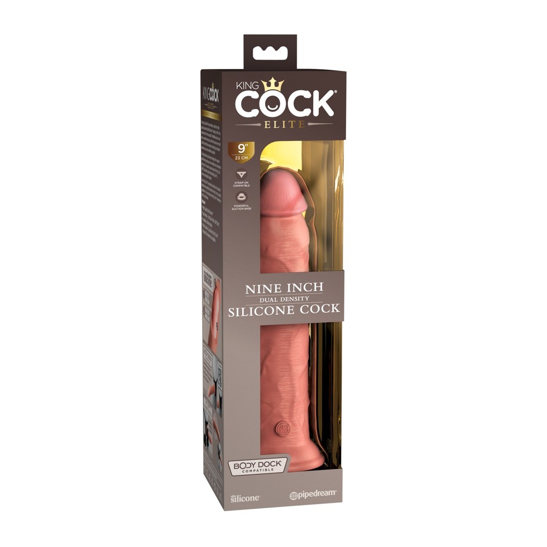 Il dildo ha una forte base a ventosa che si attacca saldamente e in modo sicuro a qualsiasi superficie liscia per un uso senza mani. Funziona perfettamente con il Body Dock Universal Harness System di King Cock Elite - ma è anche compatibile con altri strap-on e imbracature convenzionali.
