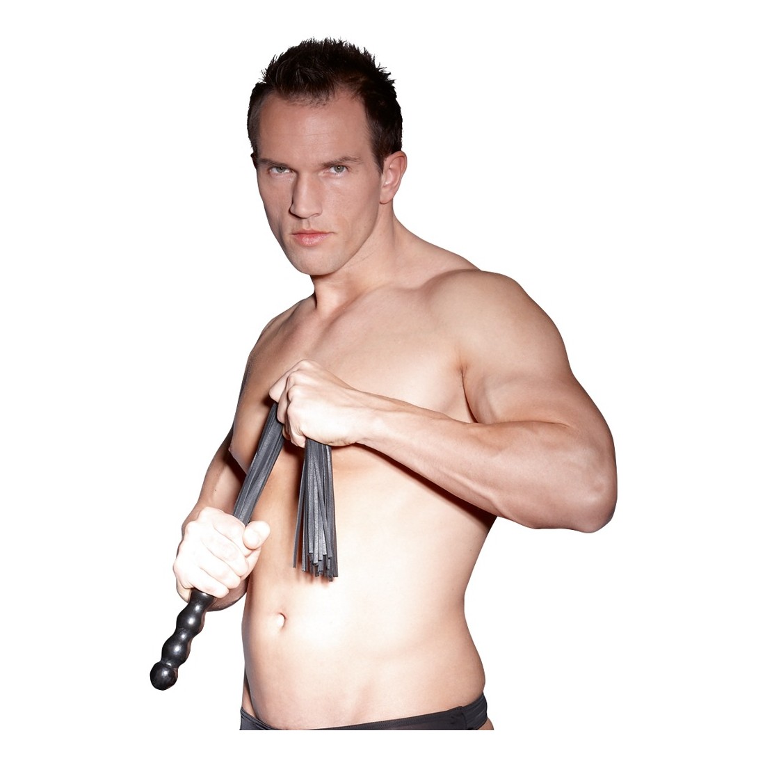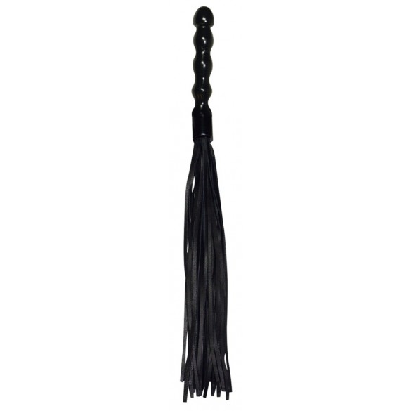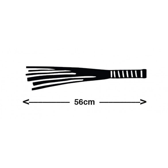 Frusta nera a più code con manico in legno ondulato. La laccatura del manico a prova di cibo permette anche di penetrare varietà di lussuria - non ci sono limiti alla vostra immaginazione ... I cinturini in morbida pelle sono adatti sia per accarezzare che per punire. Lunghezza totale 56 cm. Pelle spaccata, legno.