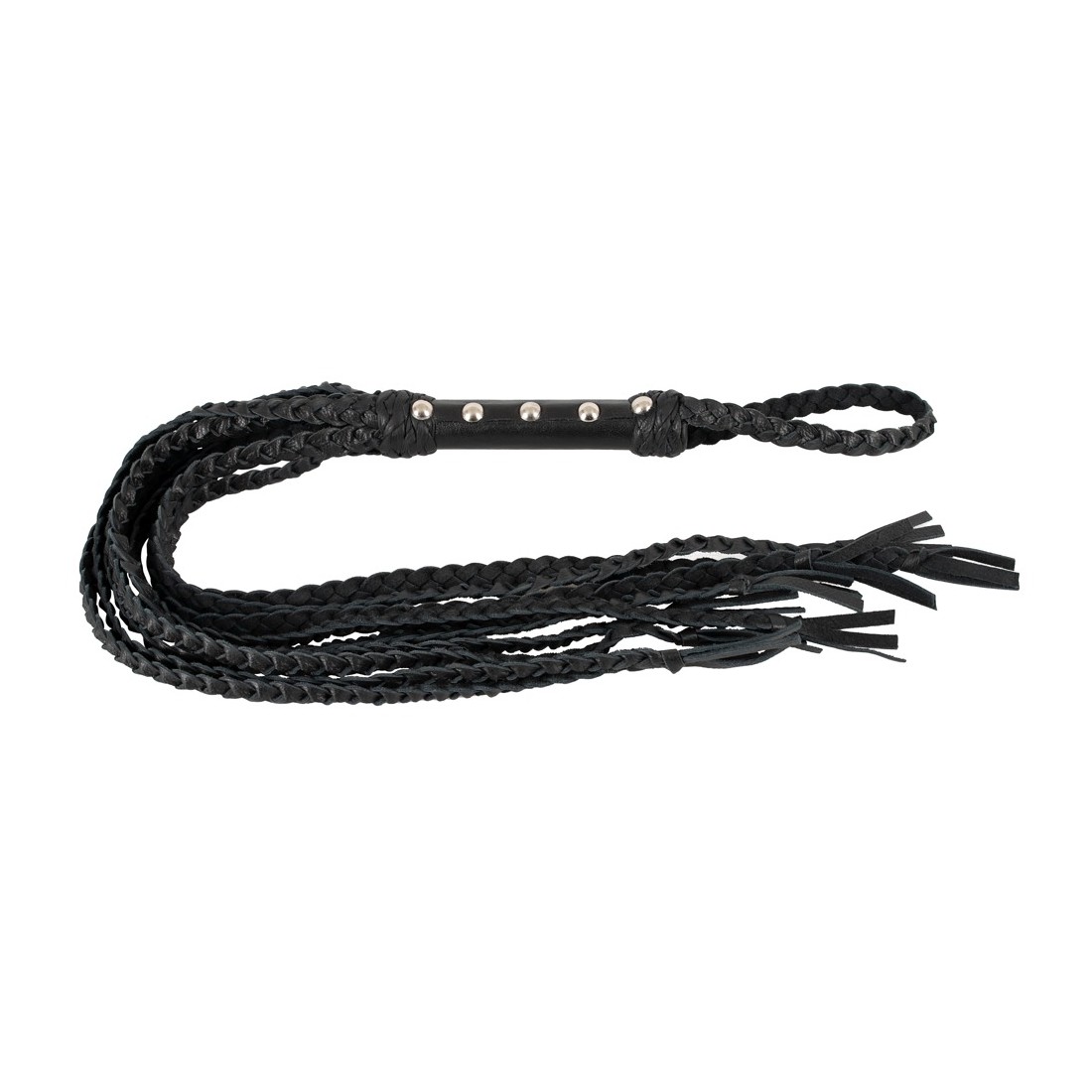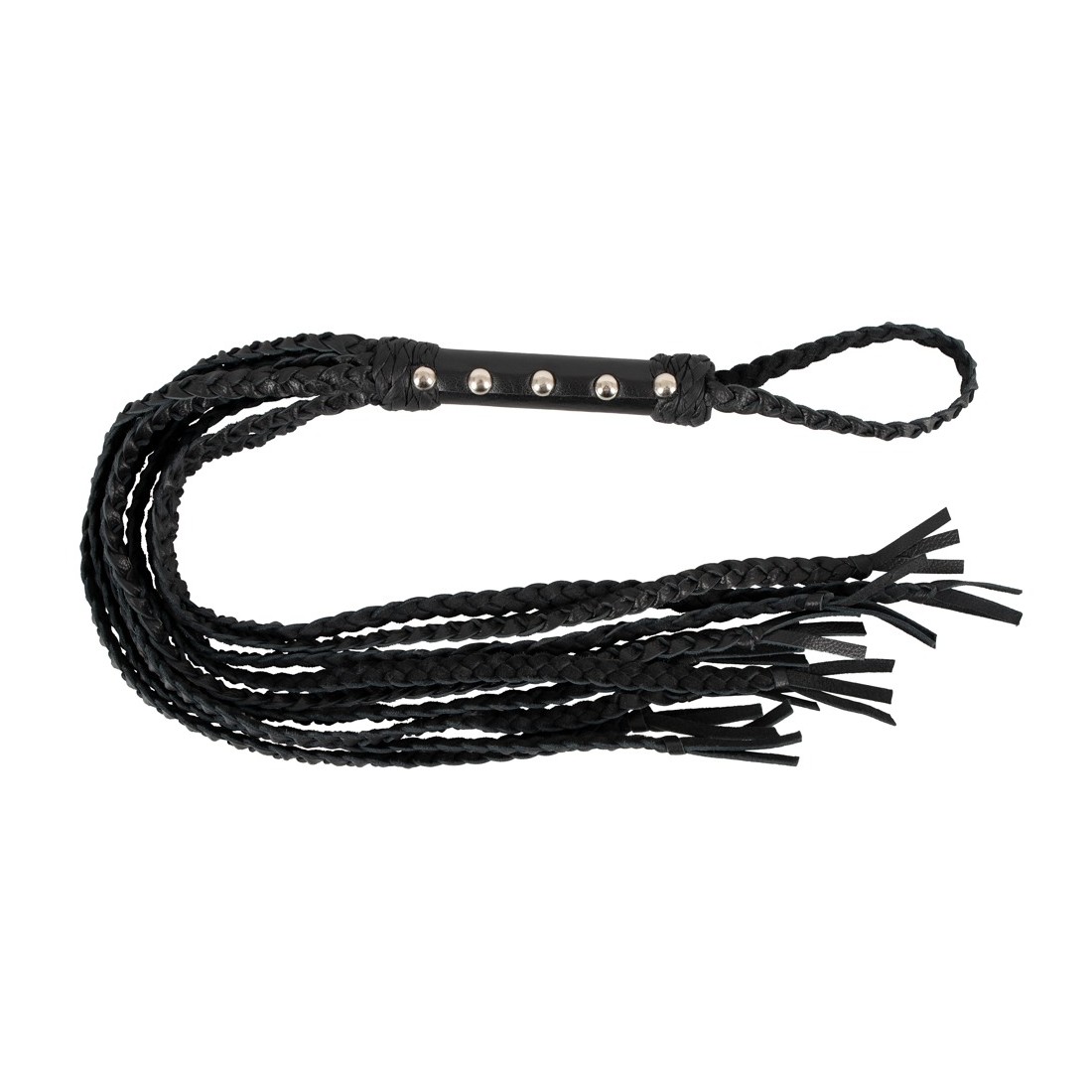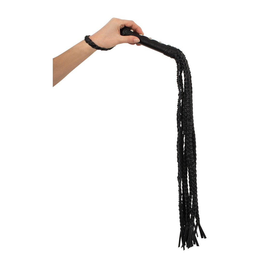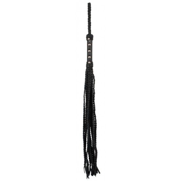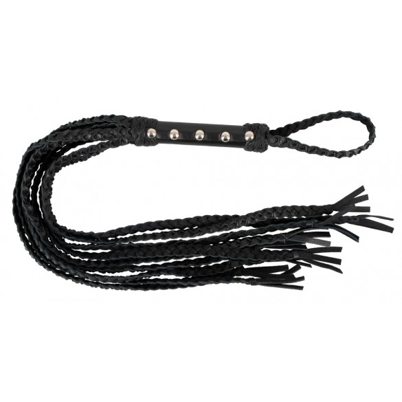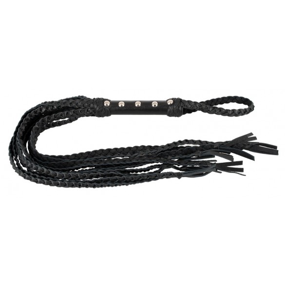Frusta con nove cinghie in pelle intrecciata per giochi di dominatore/devotatore un po' più duri. La frusta di alta qualità è completamente fatta di pelle morbida e sta bene e bilanciata nella mano con il suo manico tempestato di rivetti. All'estremità del manico con anello di tenuta/appeso.