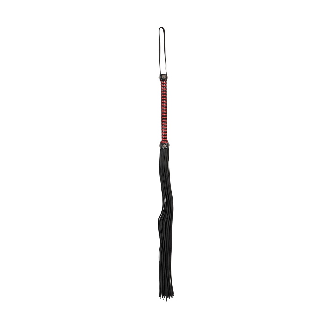 Frusta per accarezzare e battere da tenero a duro! Cinghie di pelle morbida sul manico bicolore intrecciato. Nero/rosso. Lunghezza totale circa 76 cm.