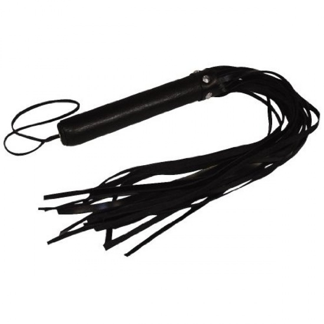 Frusta a più code con cinghie di pelle crosta nera. Impugnatura rivestita di pelle con pratica asola per il polso. Complessivamente ca. 62 cm di lunghezza.