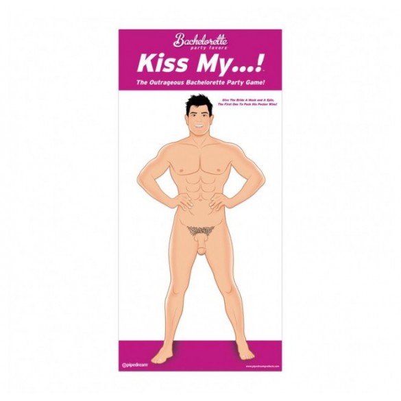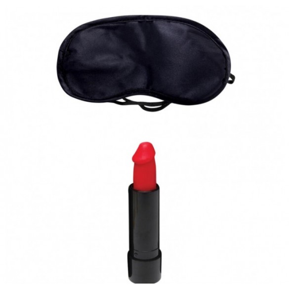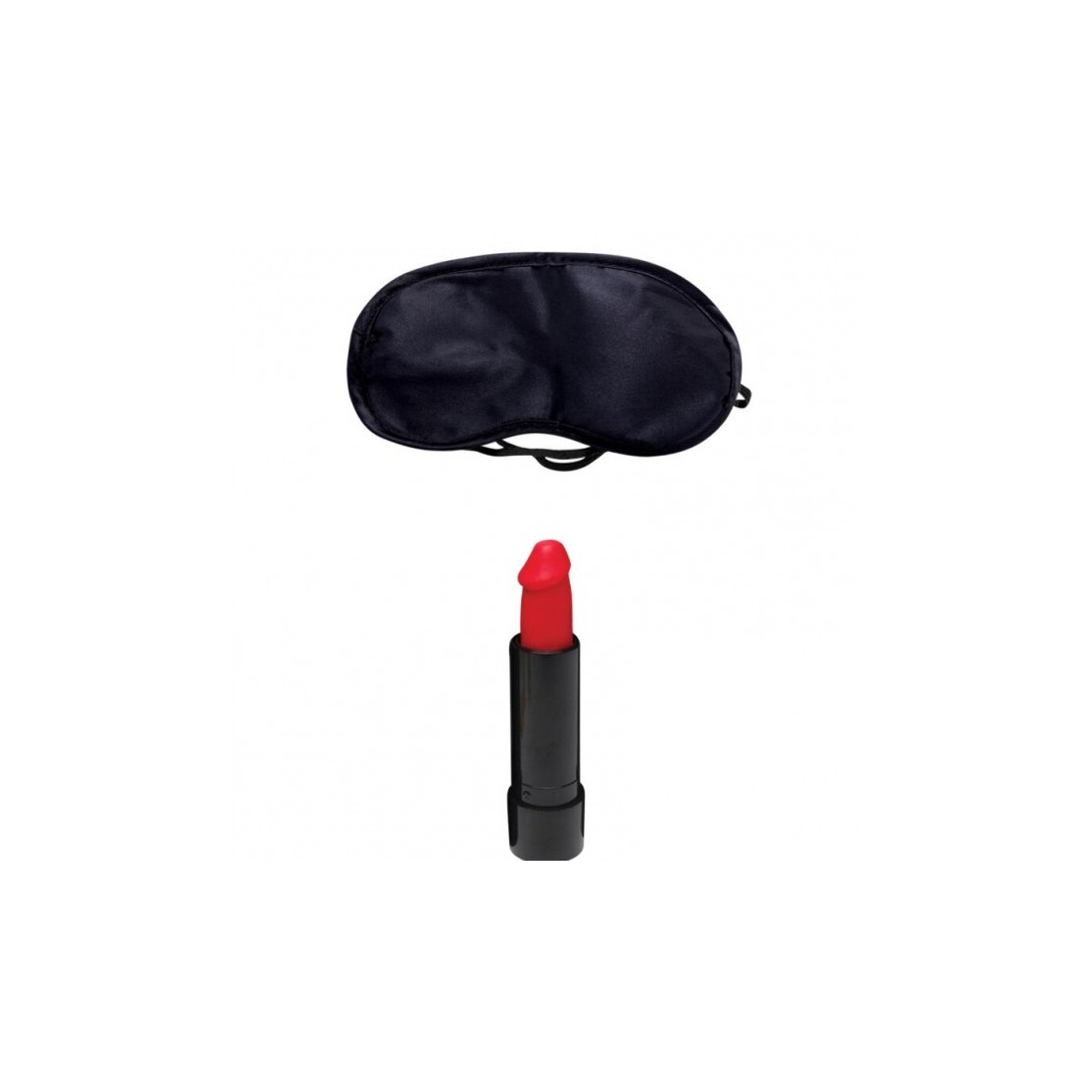 Gioco di "Baciami....!" Composto da un poster con un omone, un rossetto a forma di pene e una maschera.