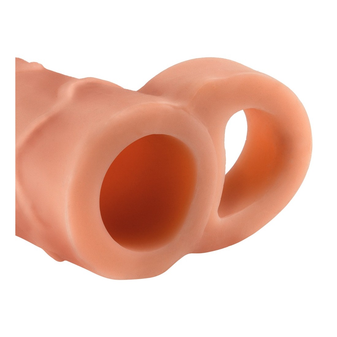 Guaina per il pene con forti venature e glande saldamente imbottito, che estende il pene di 5,1 cm. Ispessisce il pene del 33% e allo stesso tempo fornisce un supporto per l'erezione. L'anello flessibile per testicoli garantisce una calzata particolarmente solida e una sensazione di grande presa.