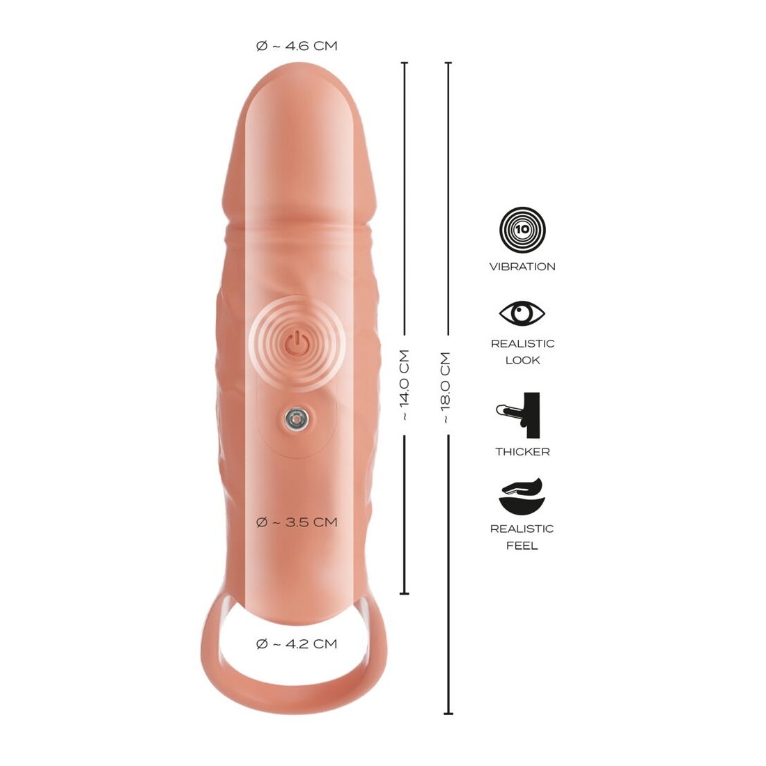 Realizzata in silicone morbido come la seta, con glande e vene pronunciati, la guaina del pene ha un aspetto molto realistico e una sensazione di vita e morbidezza al tatto. Elastica in ogni sua parte, la guaina si adatta perfettamente a qualsiasi pene. Grazie allo spessore del materiale e all'unità di vibrazione piatta e leggera, la circonferenza del pene risulta notevolmente aumentata. 10 modalità di vibrazione possono essere facilmente controllate premendo un pulsante direttamente sulla guaina.