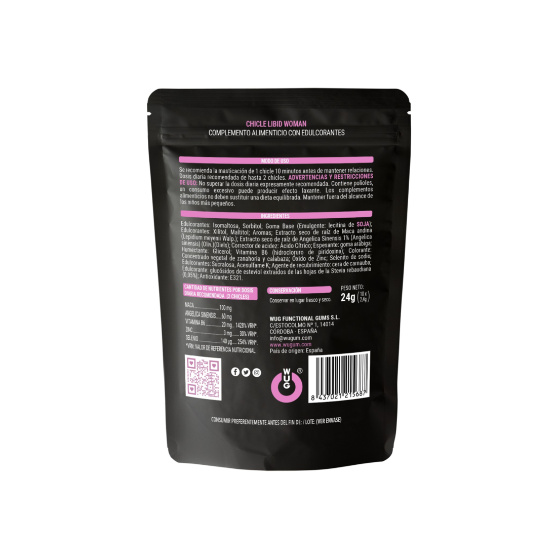 LIBID WOMAN gum incorpora 30 mg di ANGELICA SINENSIS, meglio conosciuta come "Ginseng Femminile" che aumenta i lipidi nelle donne, migliorando il flusso sanguigno nella zona vaginale e 1,5 mg di ZINCO che aumenta la fertilità contribuendo alla normale riproduzione. Include anche Maca, Selenio e Vitamina B6.
