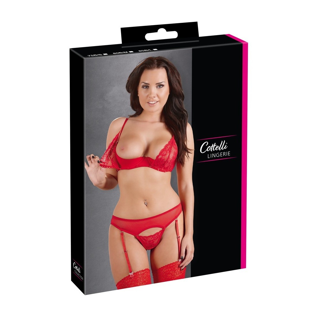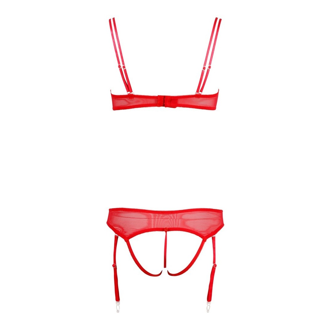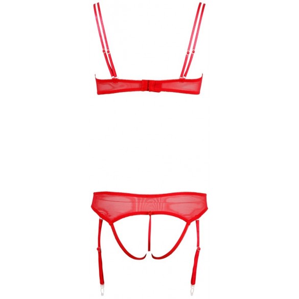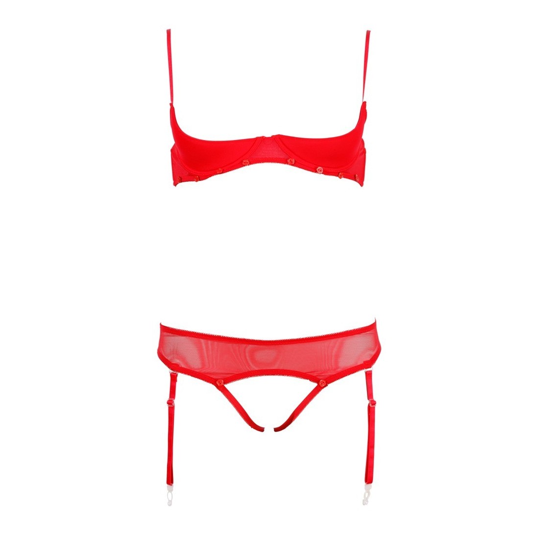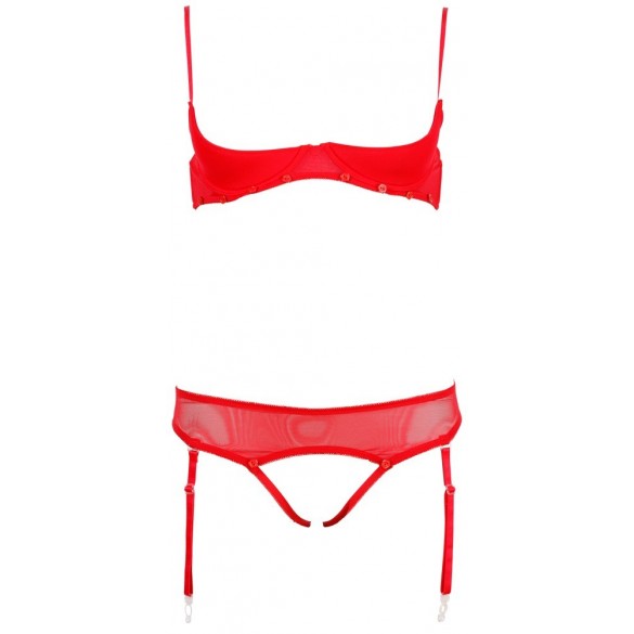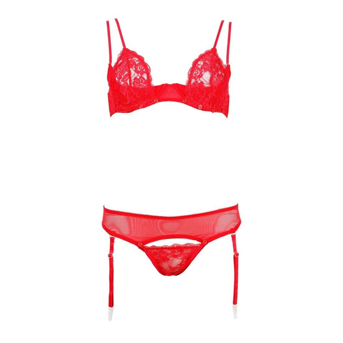 Irresistibile intimo 2 pezzi rosso in morbida microrete elasticizzata caratterizzato da inserti in pizzo removibili su reggiseno e tanga mediante piccoli bottoncini. Il primo è munito di ferretto con doppie bretelle regolabili e doppia coppa, una apribile in pizzo e l'altra interna a carioca. La parte inferiore è un tanga/reggicalze con quattro ganci amovibili e triangolo in pizzo totalmente removibile lasciando scoperto il cavallo.