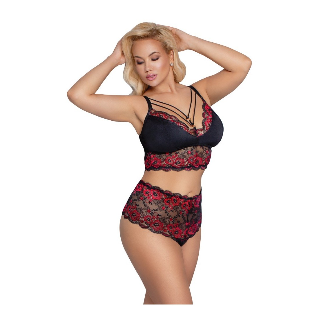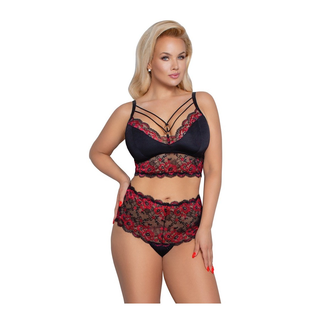 Morbido reggiseno e mutandina di Cottelli CURVES in nero opaco con prezioso pizzo floreale bicolore. Il reggiseno ha bande elastiche decorative sulla scollatura e due anelli color oro, le spalline elastiche sono regolabili in lunghezza per una perfetta vestibilità. La sottoveste in vita segna con la sua cintura alta alla moda fatta interamente di pizzo.
