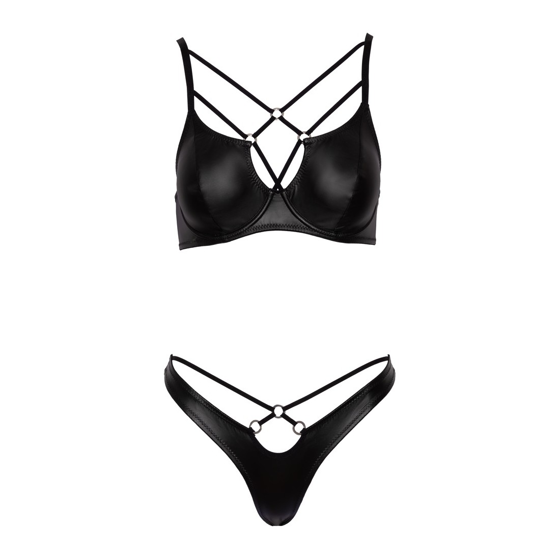 Reggiseno con ferretto e riostringente in un set di Cottelli LINGERIE. Elegante look nero opaco con dettagli decorativi di cinghie elastiche e anelli argentati sul décolleté e sulla cintura anteriore a stringa. Elastico dappertutto per una vestibilità comoda e aderente. Reggiseno con spalline regolabili e chiusura a gancio sulla schiena.