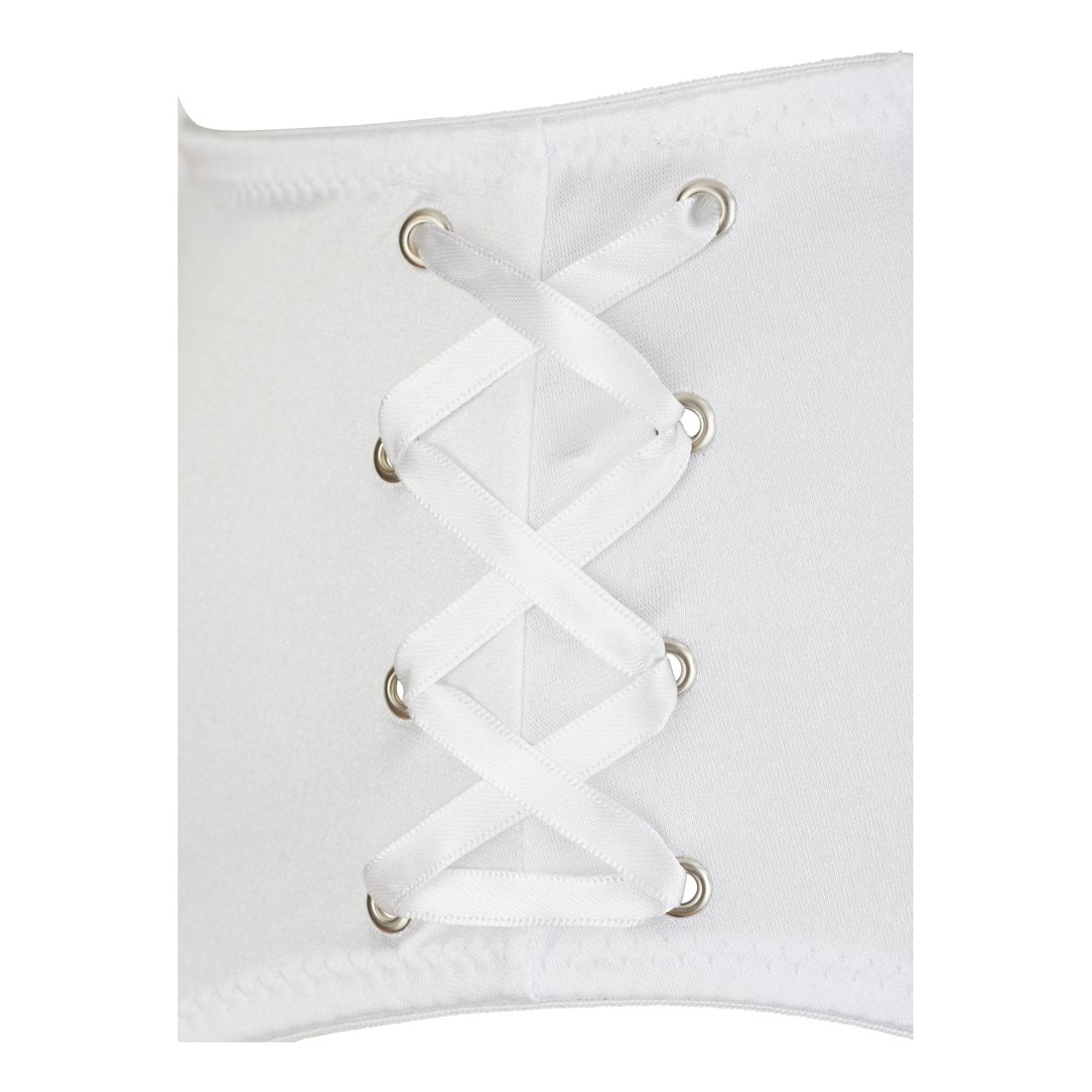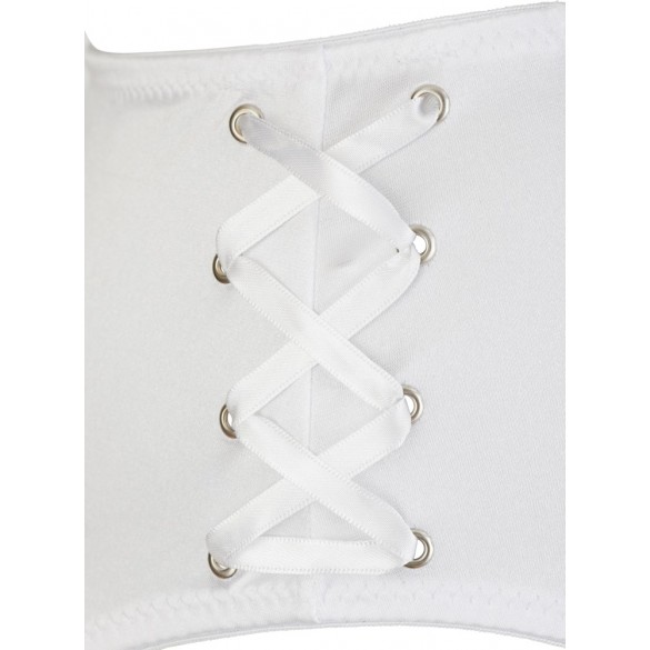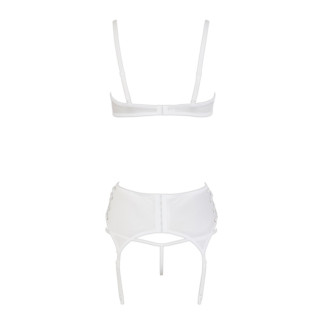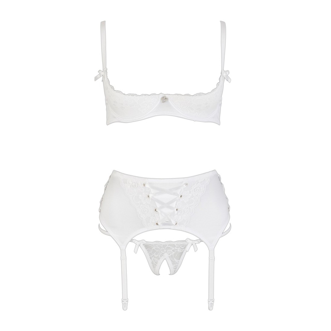 Lift e reggicalze in raso elasticizzato con inserto in pizzo, perizoma completamente in pizzo. Ferretto con cuore in strass tra le coppe leggermente imbottite e chiusura a gancio sulla schiena. Reggicalze con allacciatura decorativa e chiusura a gancio sul retro. Cinghie e bretelle regolabili. Stringa seducentemente crotchless.
