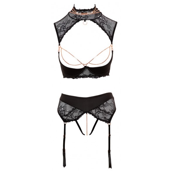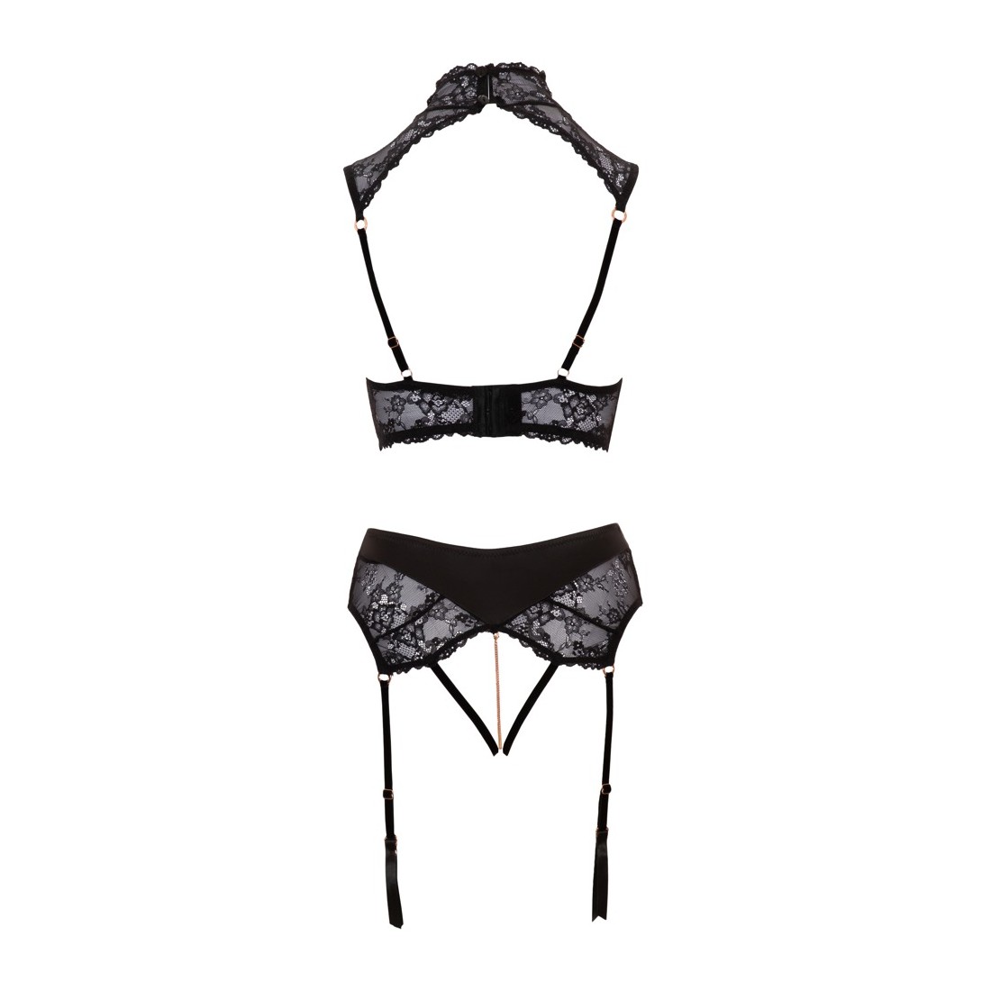 Seducente duo di Abierta Fina. Alzabandiera con coppe leggermente imbottite con ferretto in un design insolito. Inserti decorativi in pizzo corrono insieme sopra le spalline per formare un grande colletto. Gli elementi color oro rosa enfatizzano abilmente il décolleté e stuzzicano sensualmente la vagina ad ogni movimento del cavallo. Tutti gli elementi possono essere rimossi con un piccolo moschettone. Il perizoma colpisce anche per il suo cavallo aperto e i nastri di raso sopra le chiusure delle 4 bretelle.