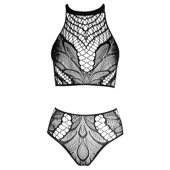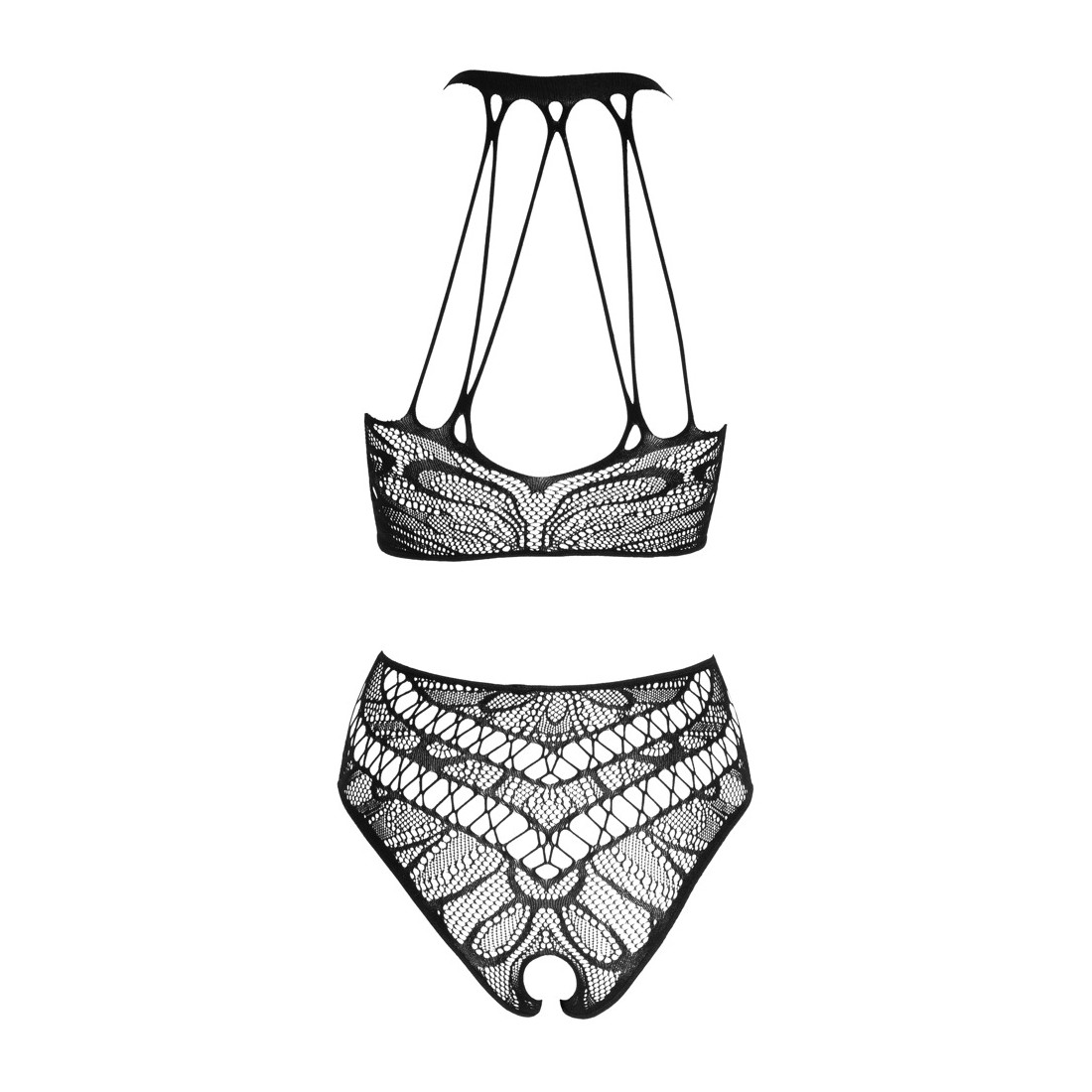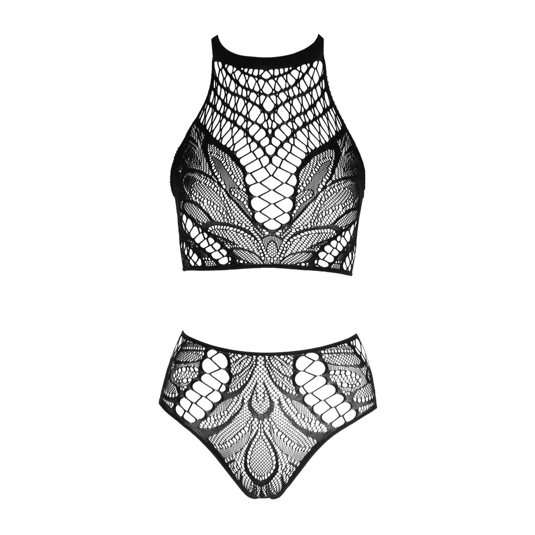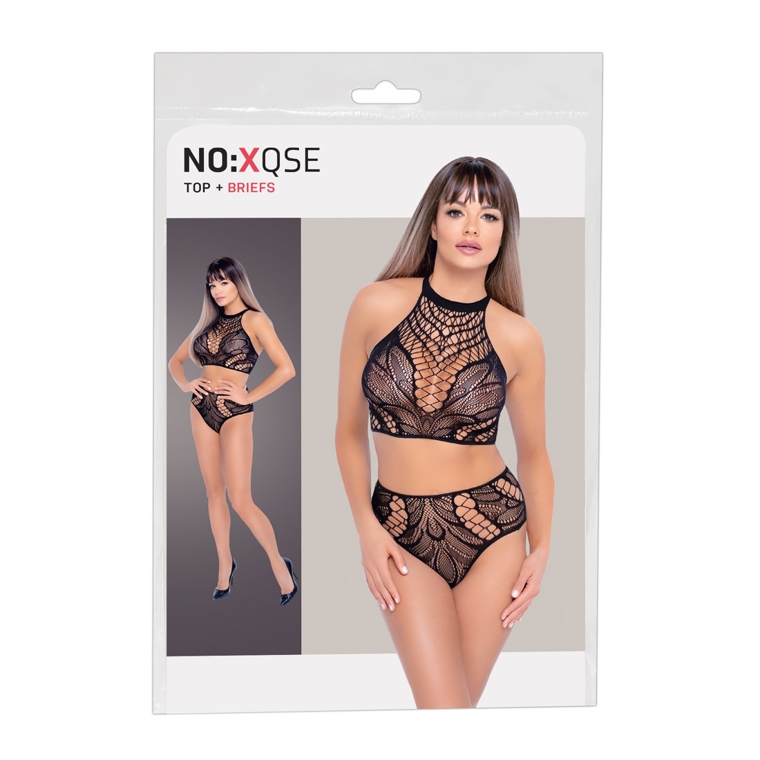 Top e mutandine crotchless di NO:XQSE in diverse strutture a rete. Top con fascia elastica al collo, con bande elastiche sul retro. Slip con taglio alto e apertura invitante sul cavallo. Il tutto realizzato senza cuciture e altamente elastico per un comfort estremamente piacevole da indossare.