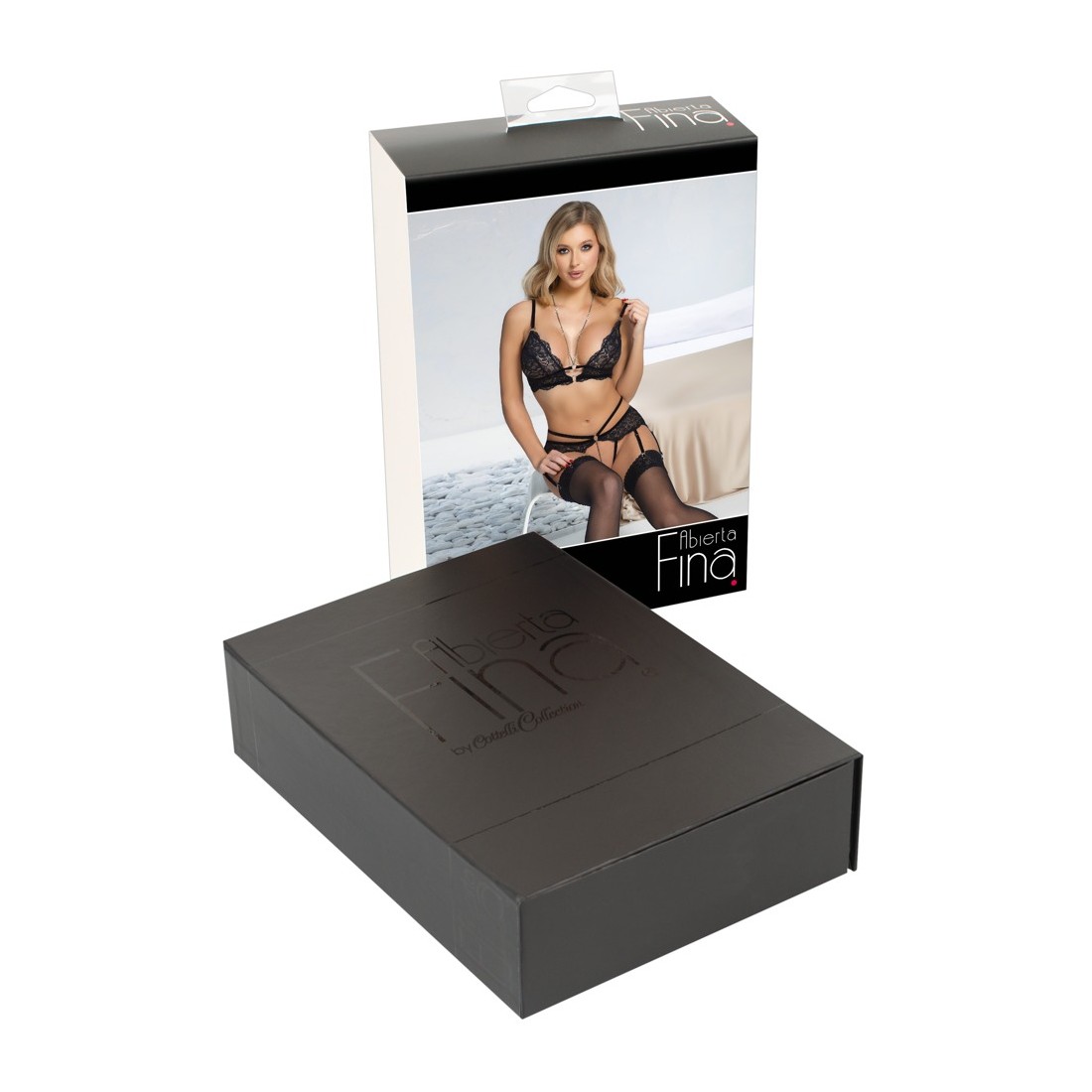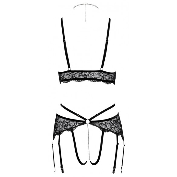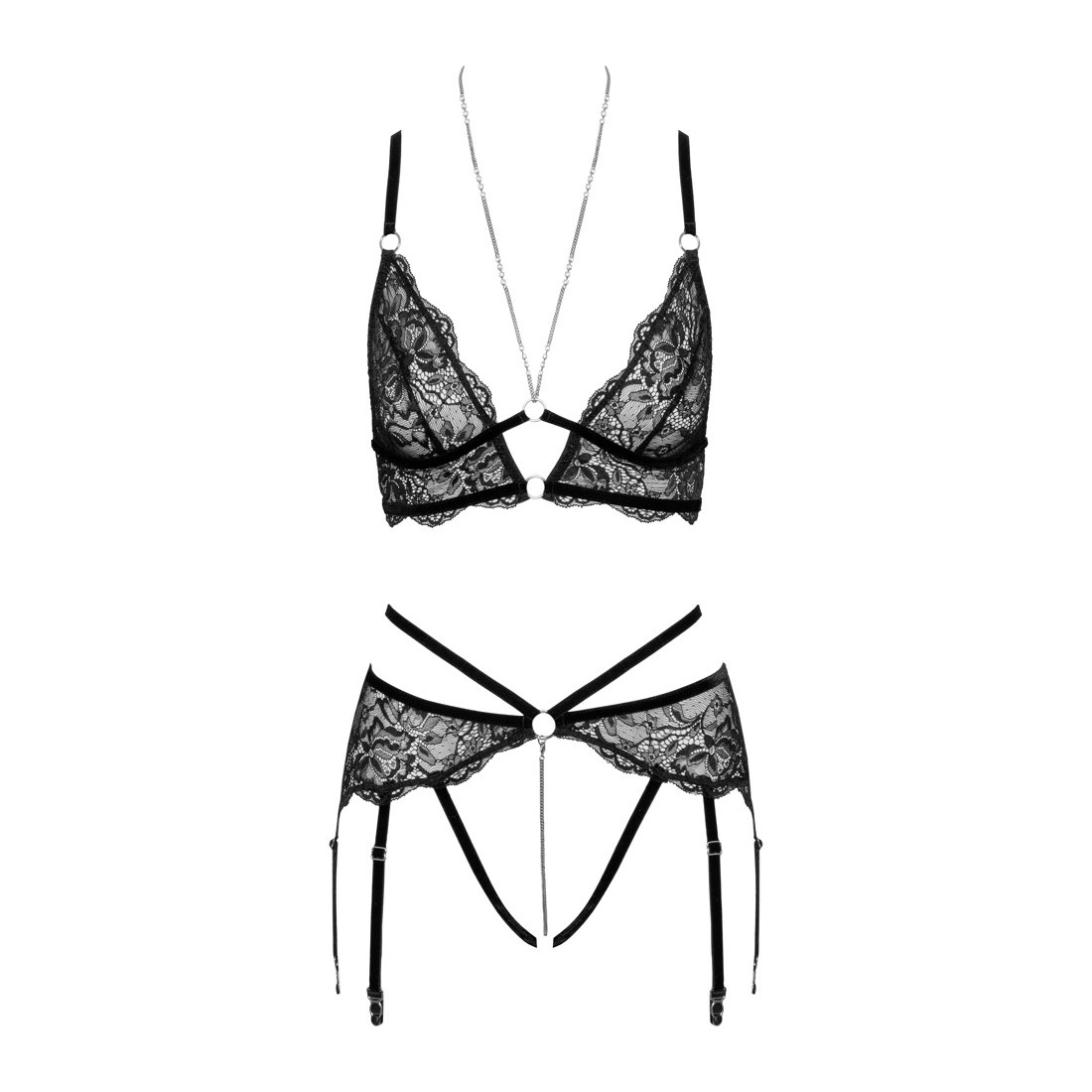 Bralette e perizoma con bretelle senza cavallo in un set di Abierta Fina. Fine pizzo elastico nero e morbido velluto in uno stile eccitante con anelli color argento e dettagli a catena. Bralette con catenella regolabile e staccabile come allacciatura al collo. Cinghie regolabili. Il perizoma della bretella è completamente senza cavallo con catenelle stimolanti che attraversano il cavallo che possono essere rimosse. Anche le 6 bretelle e la fascia in vita sono regolabili.
