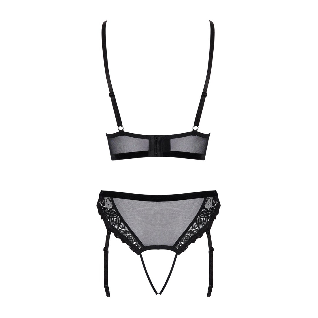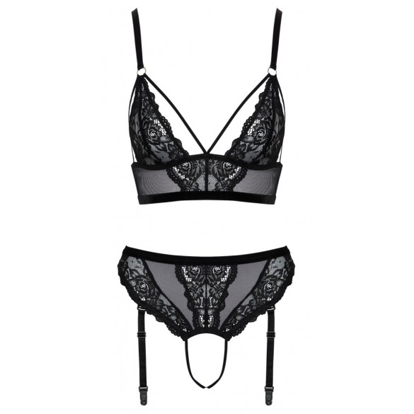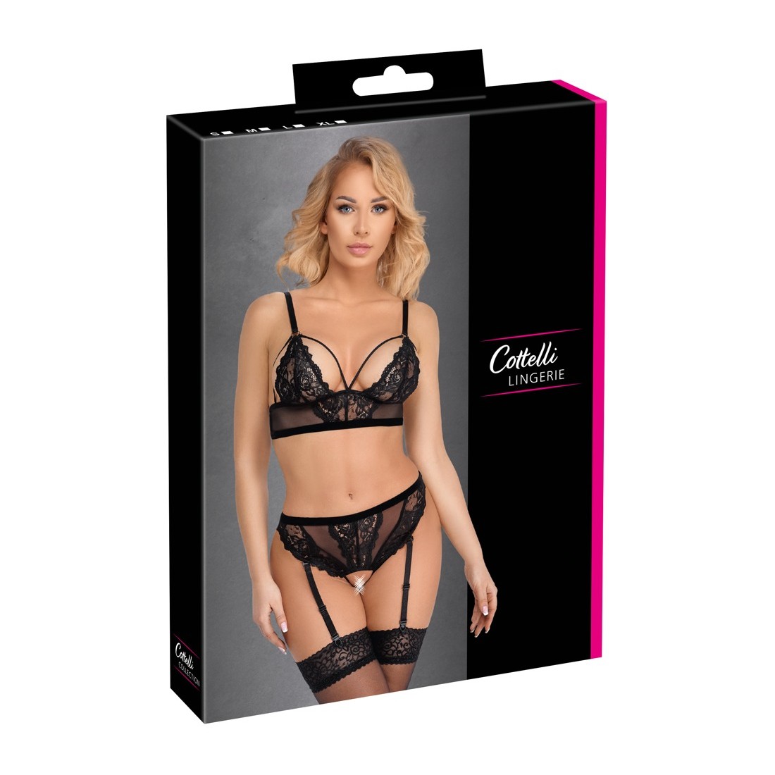 Set bralette e perizoma con reggicalze senza cavallo di Cottelli LINGERIE in un delicato mix di pizzo nero e powernet. Morbido ed elastico tutt'intorno per un comfort elevato. Il reggiseno dal taglio più lungo colpisce per le sue spalline elasticizzate sullo scollo, il perizoma all'altezza della vita con il cavallo completamente aperto. Le spalline sono regolabili per adattarsi, così come le bretelle, anch'esse completamente removibili dal perizoma.