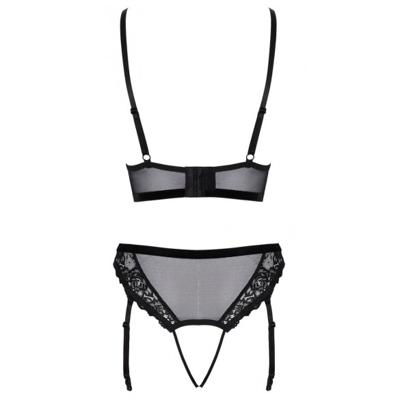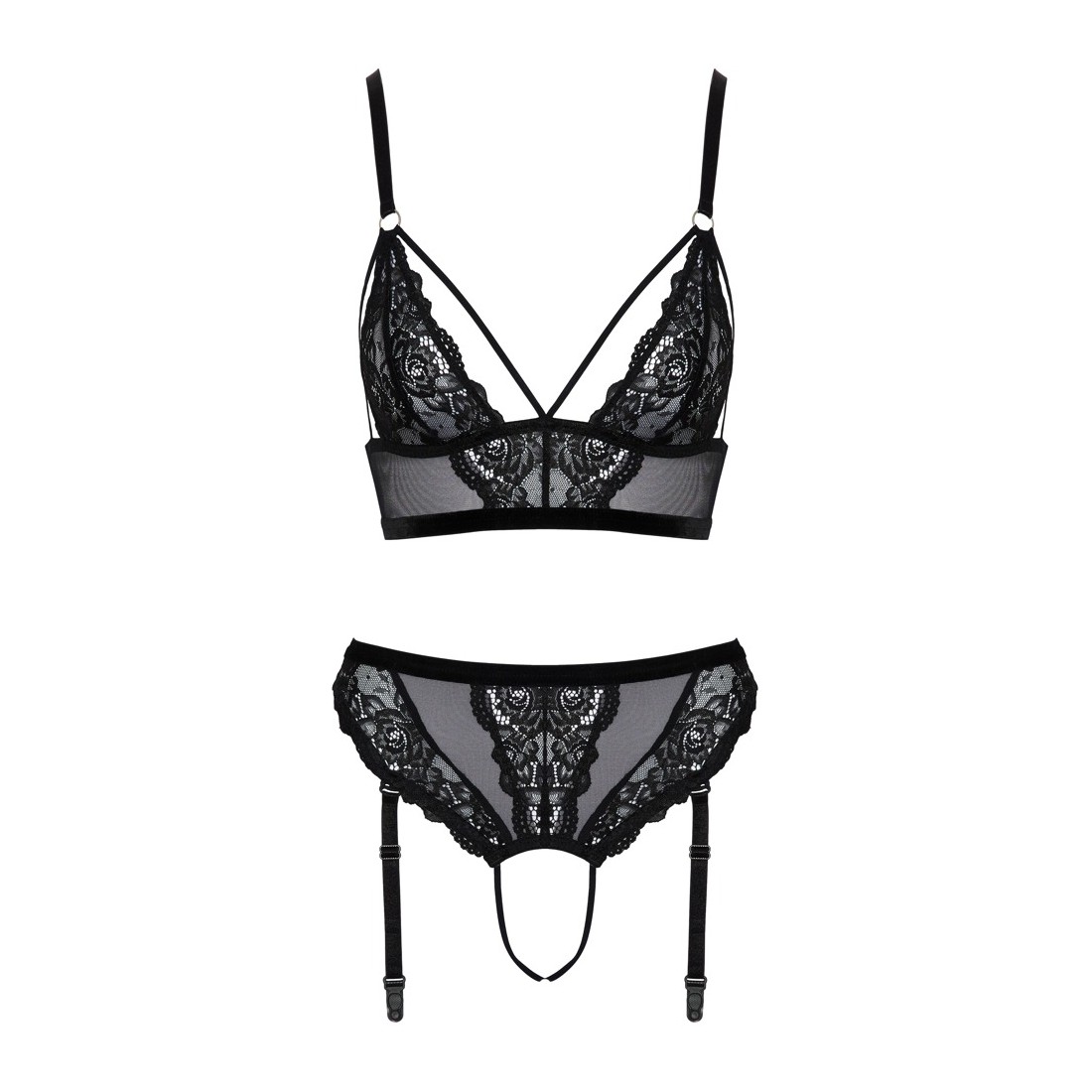 Set bralette e perizoma con reggicalze senza cavallo di Cottelli LINGERIE in un delicato mix di pizzo nero e powernet. Morbido ed elastico tutt'intorno per un comfort elevato. Il reggiseno dal taglio più lungo colpisce per le sue spalline elasticizzate sullo scollo, il perizoma all'altezza della vita con il cavallo completamente aperto. Le spalline sono regolabili per adattarsi, così come le bretelle, anch'esse completamente removibili dal perizoma.