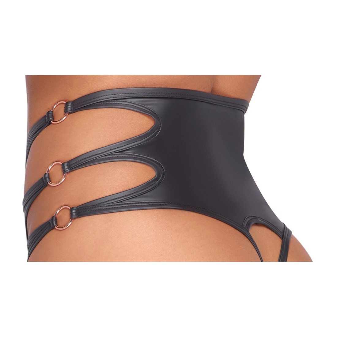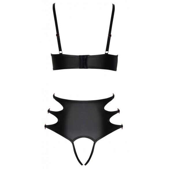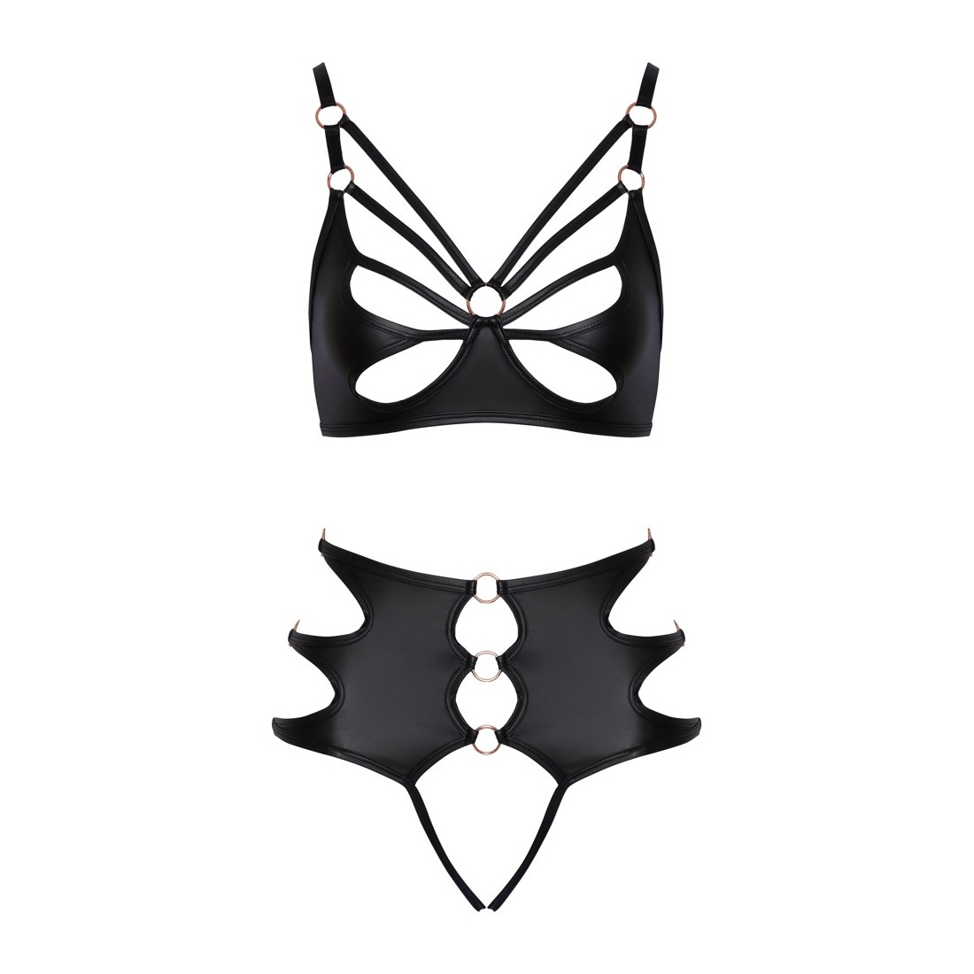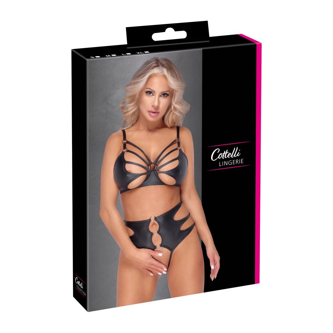 Un reggiseno e mutandine senza cavallo in un set di Cottelli LINGERIE realizzato in morbido materiale elasticizzato nero. Uno stile audace con cinturini elastici e anelli color oro rosa. Reggiseno morbido con chiusura con gancio sul retro e spalline regolabili abbinate. Le mutandine dal taglio alto in vita seducono con 2 fasce elastiche attorno al cavallo completamente aperto.