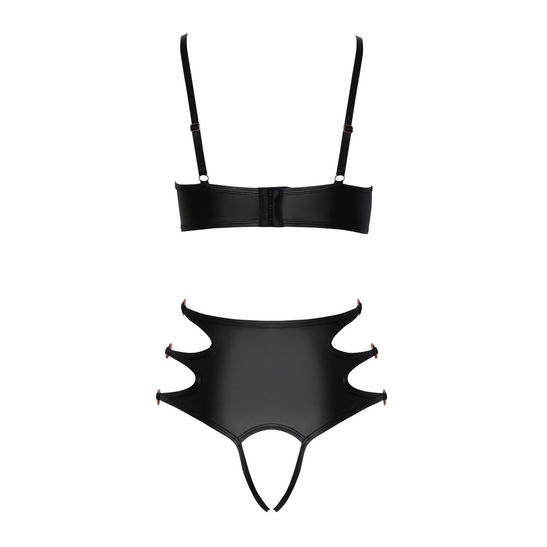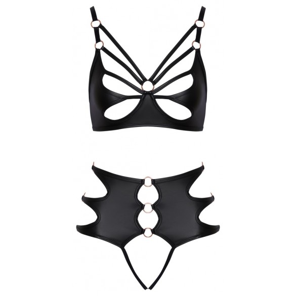 Un reggiseno e mutandine senza cavallo in un set di Cottelli LINGERIE realizzato in morbido materiale elasticizzato nero. Uno stile audace con cinturini elastici e anelli color oro rosa. Reggiseno morbido con chiusura con gancio sul retro e spalline regolabili abbinate. Le mutandine dal taglio alto in vita seducono con 2 fasce elastiche attorno al cavallo completamente aperto.