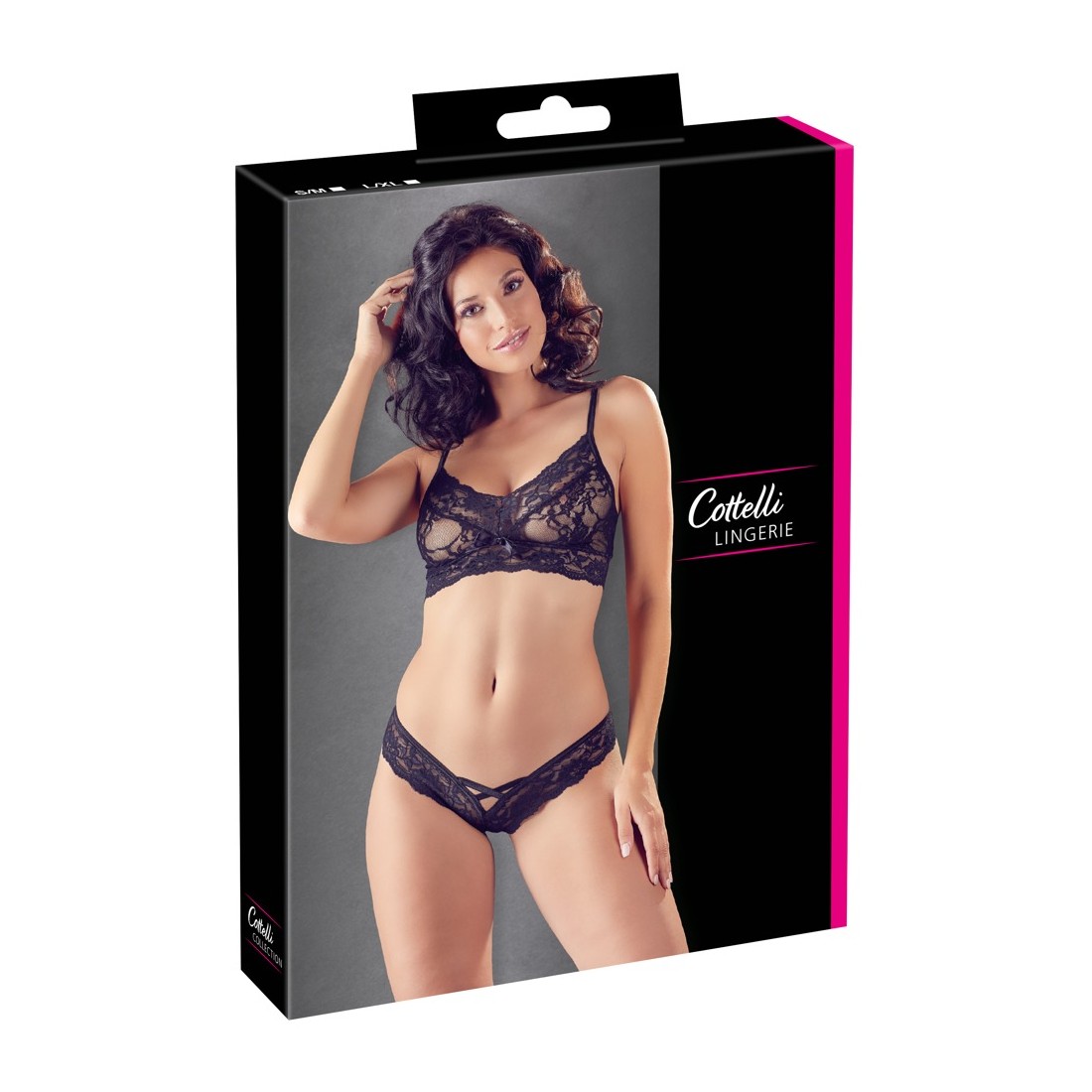 Reggiseno e mutandine in morbido pizzo. Reggiseno con spalline elasticizzate che corrono trasversalmente sulla schiena. Slip davanti e sopra il fondo con spalline elastiche incrociate.