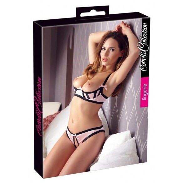 Set in raso rosa con dettagli neri. Reggiseno con ferretto con coppe leggermente imbottite e spalline regolabili. Chiusura con gancio sul retro. Slip in tinta aperto al cavallo. 88% poliammide 12% elastan. Senza calze.TAGLIA M.