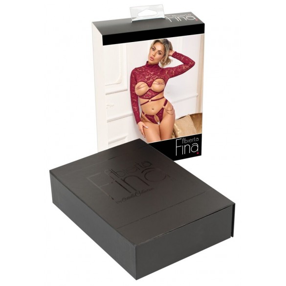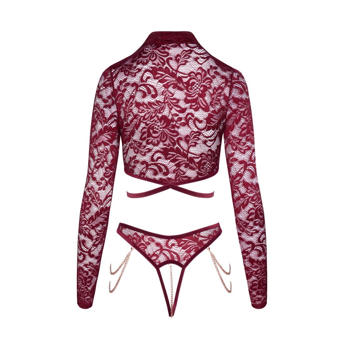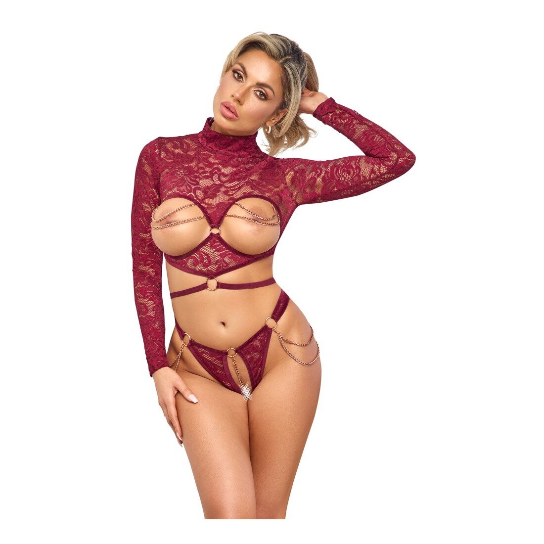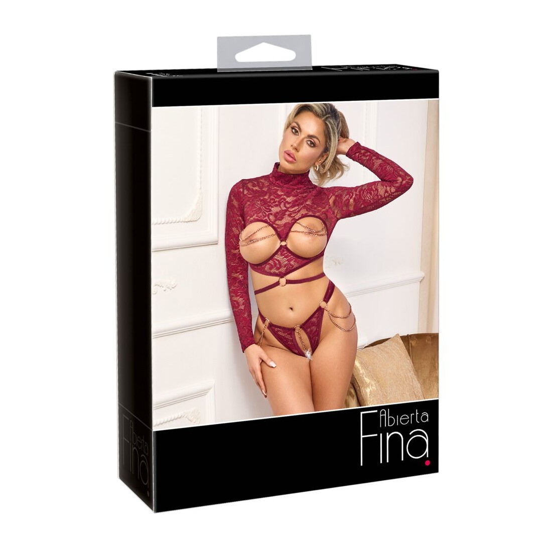Eccitante set di Abierta Fina con top a maniche lunghe senza busto e perizoma inguinale. Fine pizzo rosso scuro seducente con nastri di velluto e catene e anelli color oro rosa. Morbido ed elastico su tutto il corpo per un elevato livello di comfort. Top morbido con piccolo collo alto e cintura in velluto. Le catene gioiello sul busto esposto possono essere completamente rimosse. Così come le catene doppie sulle cosce e la catena stimolante nel cavallo aperto.