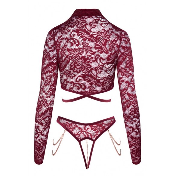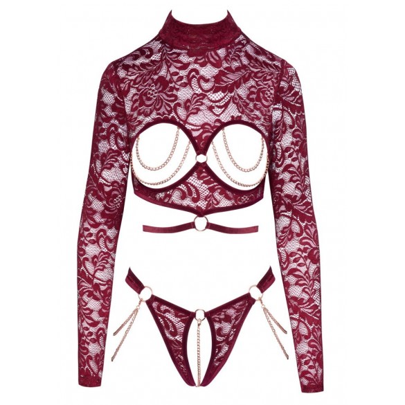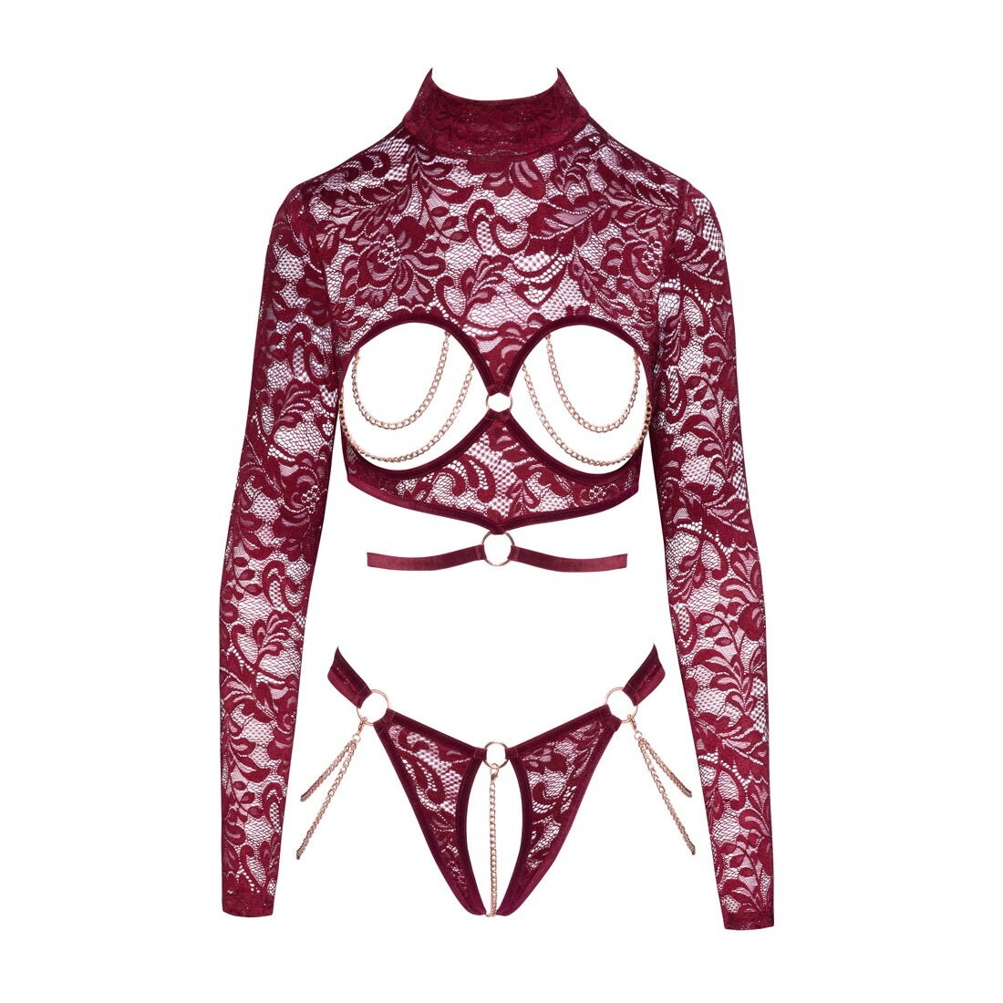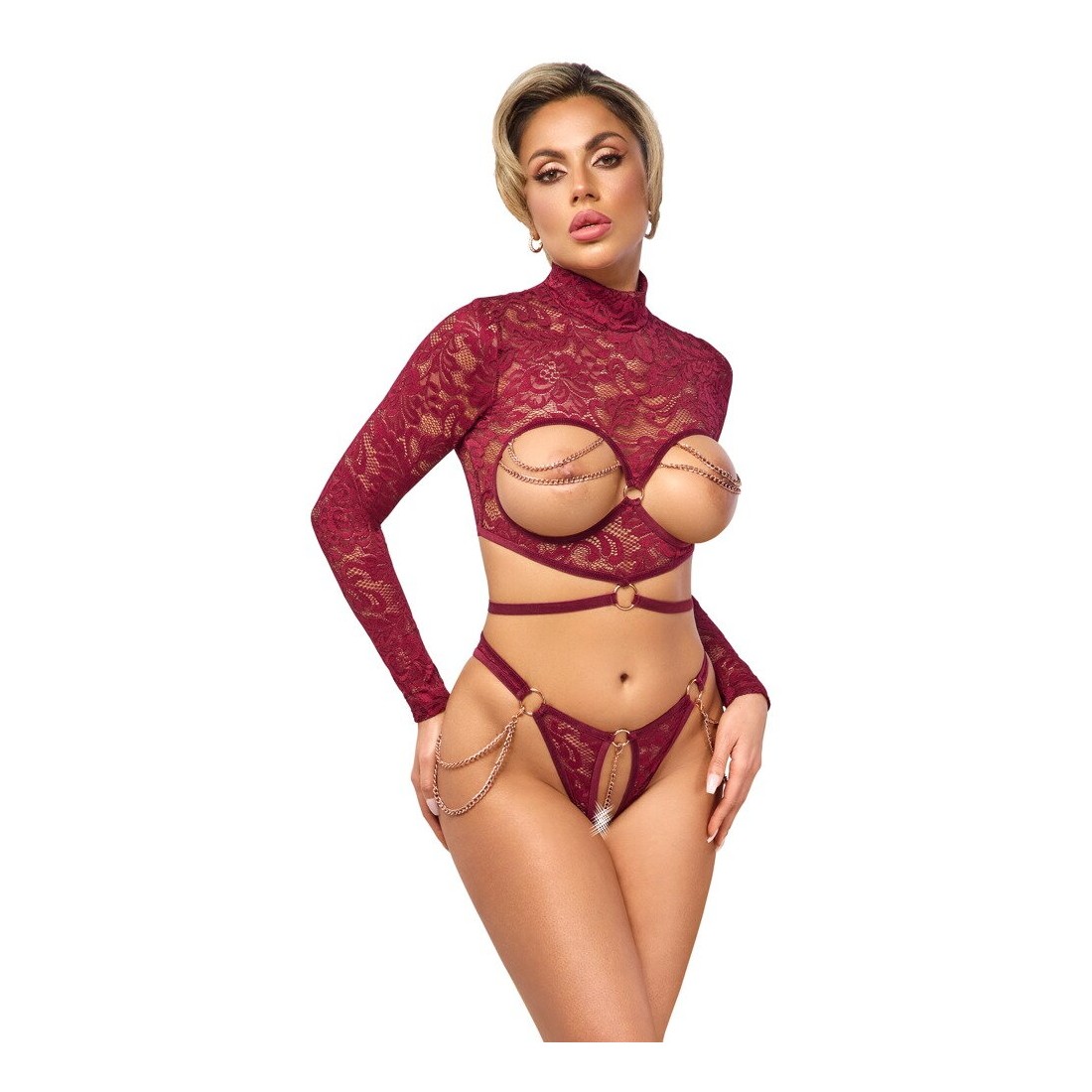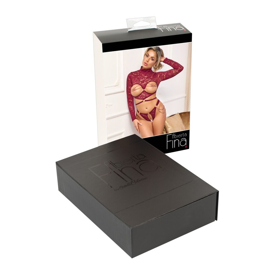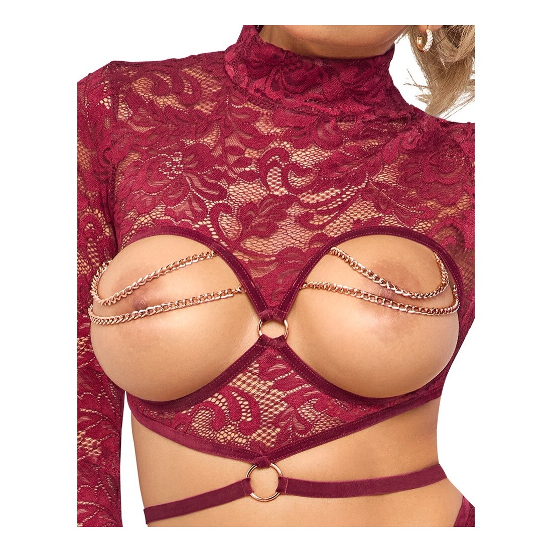 Eccitante set di Abierta Fina con top a maniche lunghe senza busto e perizoma inguinale. Fine pizzo rosso scuro seducente con nastri di velluto e catene e anelli color oro rosa. Morbido ed elastico su tutto il corpo per un elevato livello di comfort. Top morbido con piccolo collo alto e cintura in velluto. Le catene gioiello sul busto esposto possono essere completamente rimosse. Così come le catene doppie sulle cosce e la catena stimolante nel cavallo aperto.