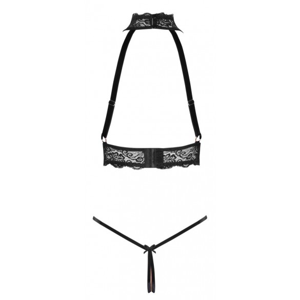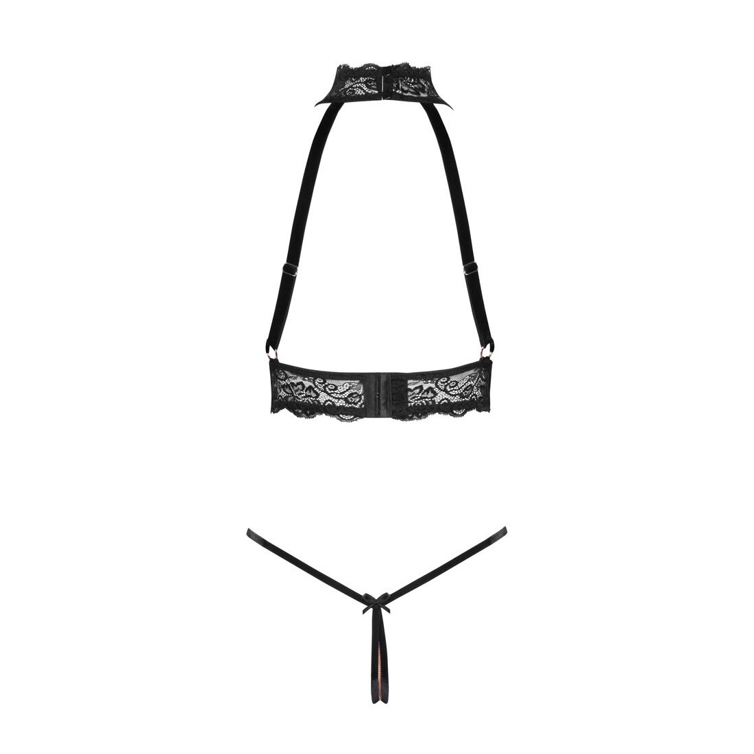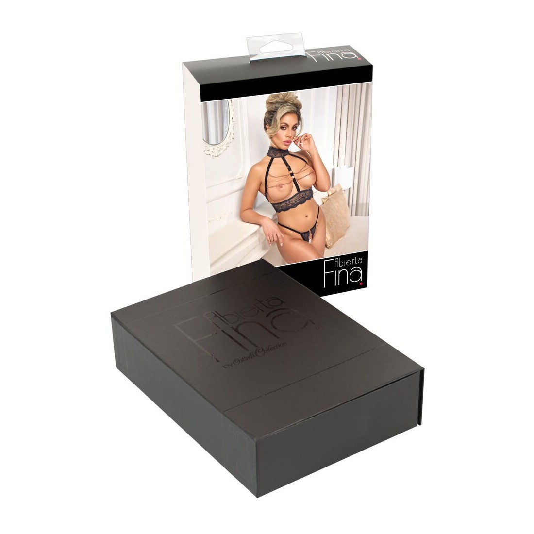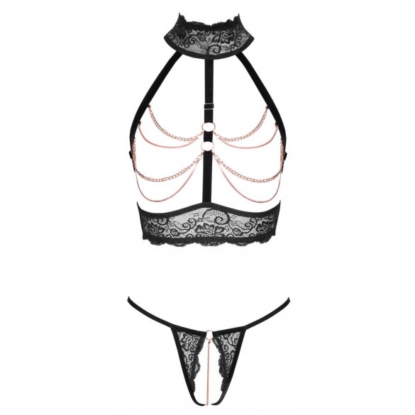 Eccitante set overt di Abierta Fina con top senza seno e perizoma inguinale. Morbido pizzo nero elasticizzato, spalline in velluto e catene color oro rosa creano una scena seducente! Top ouvert con cinghie e spalline in velluto regolabili abbinate. Anche la chiusura a gancio sul retro può essere regolata per adattarsi. Il collo in pizzo si chiude con 2 bottoni sulla nuca. La stringa seduce con una catena stimolante nel cavallo aperto, che può anche essere rimossa.