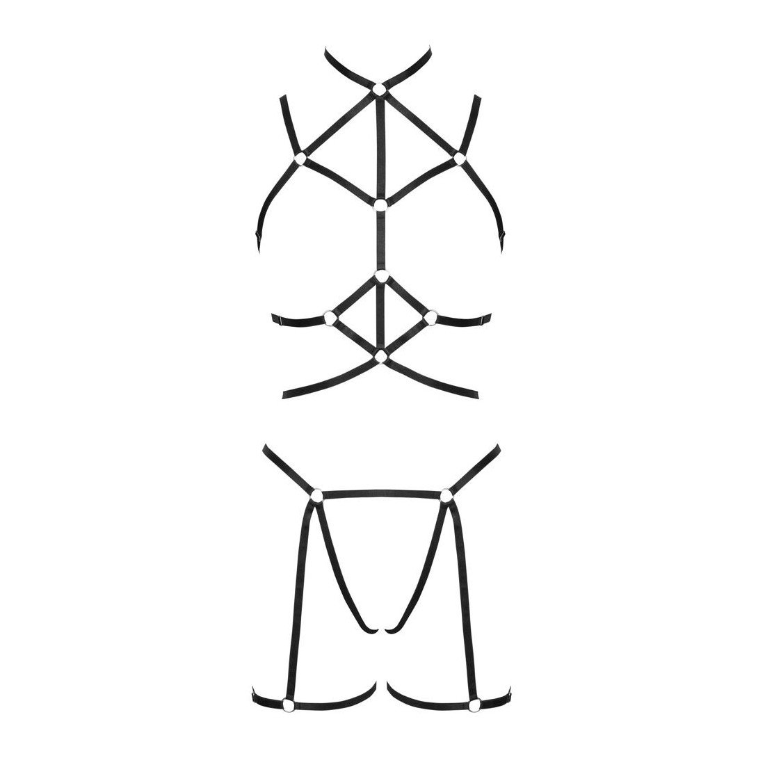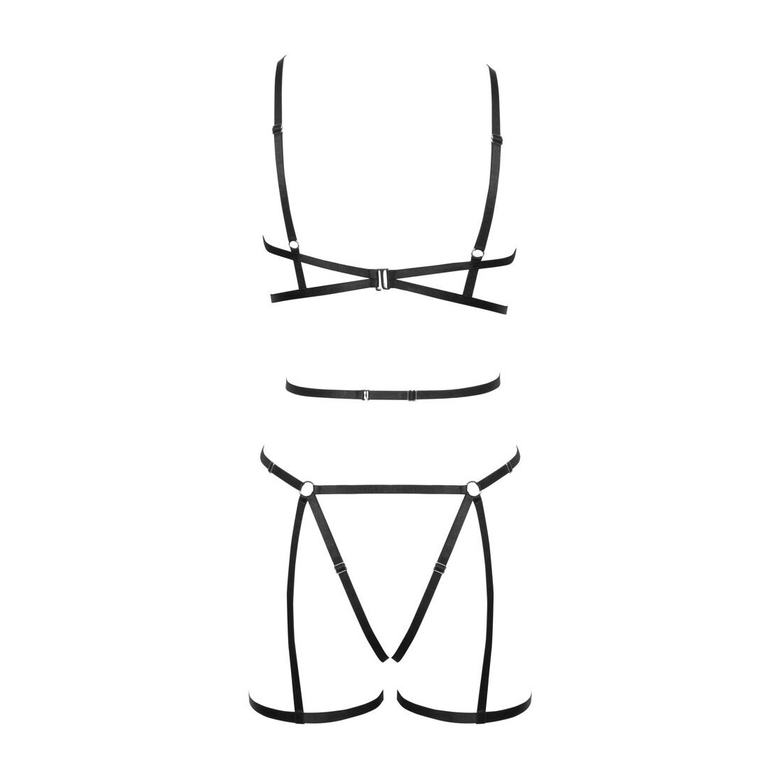 Set di imbracature nere a 3 pezzi di Cottelli LINGERIE con imbracatura per il seno e per i fianchi, compreso un piccolo perizoma. Entrambe le imbracature sono realizzate con cinghie elastiche morbide, setose e lucide e anelli di collegamento color argento. Le cinghie sono multiregolabili per una vestibilità perfetta. Top con chiusura a gancio sul collo e sulla schiena.