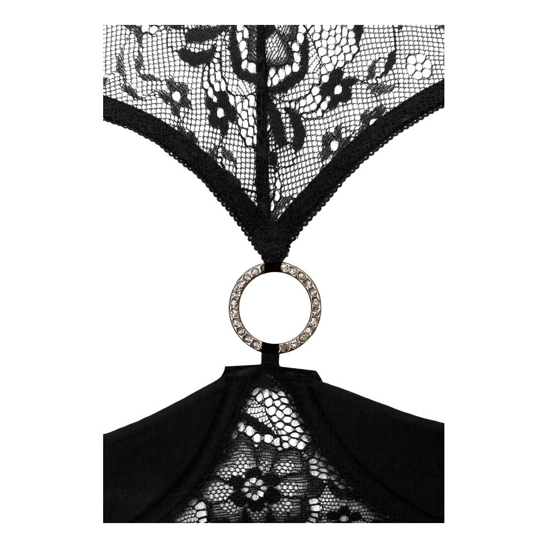 Questa bella Ebe forma il seno e lo mette in scena. Le coppe leggermente imbottite sollevano il seno e il pizzo incornicia questa vista, mentre l'anello luccicante dirige lo sguardo verso le cose più importanti. Il perizoma è inguine aperto, con orlo in pizzo e fasce flessibili.