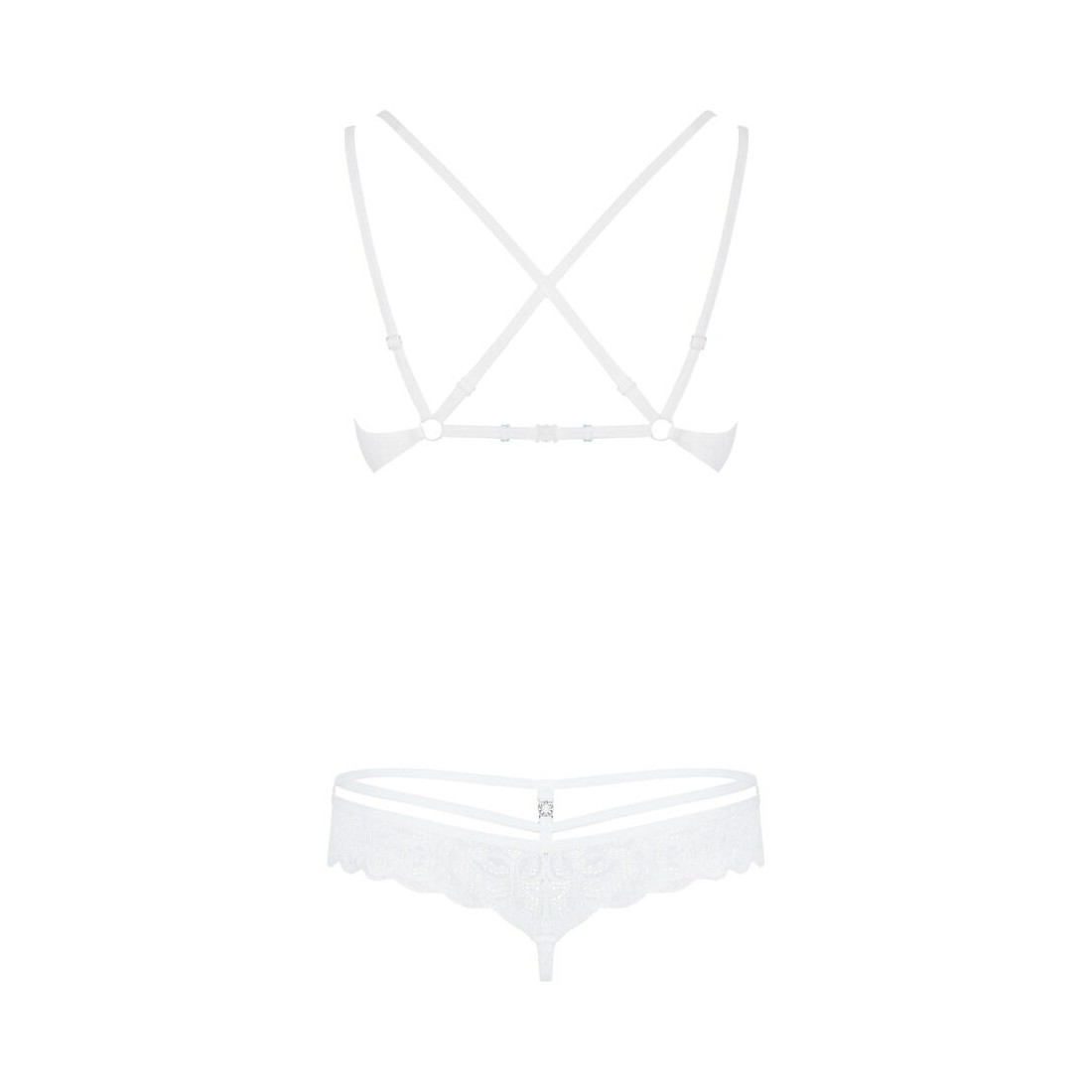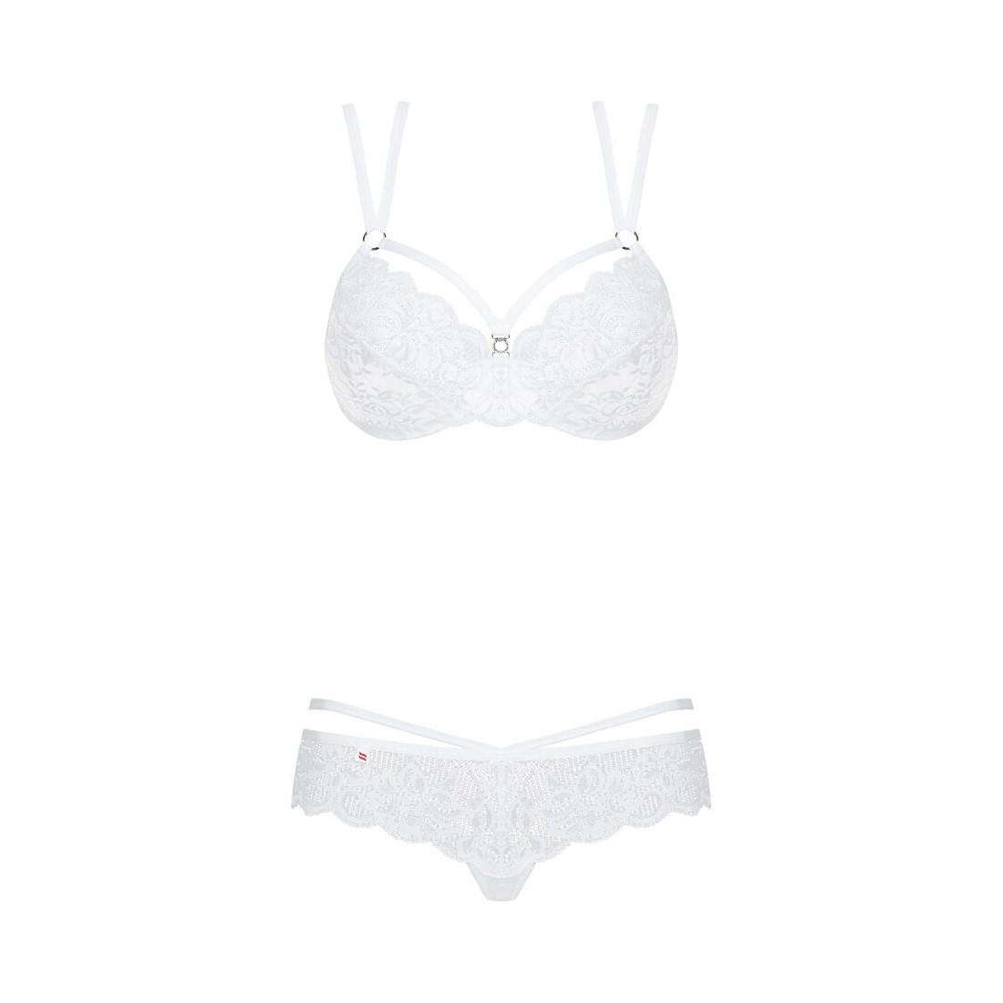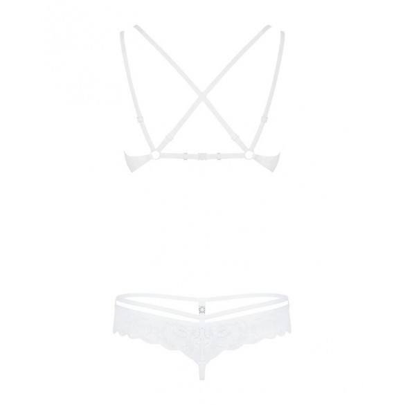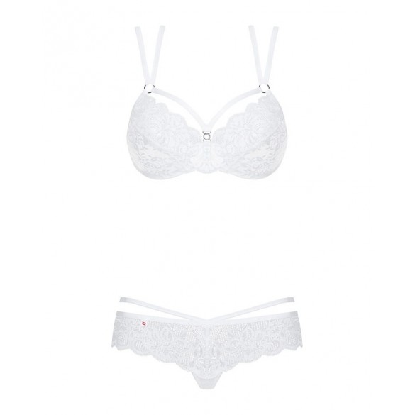 860-SET-2 di Obsessive con reggiseno con ferretto e perizoma in pregiato pizzo floreale bianco. Morbido ed elasticizzato su tutto il corpo per un elevato livello di comfort. Reggiseno con ferretto e coppe con dettaglio gioiello. Le doppie spalline regolabili si incrociano sulla schiena. Il taglio sofisticato del perizoma con laccetti in vita e dettaglio decorativo sottolinea in modo seducente i fianchi e il sedere.