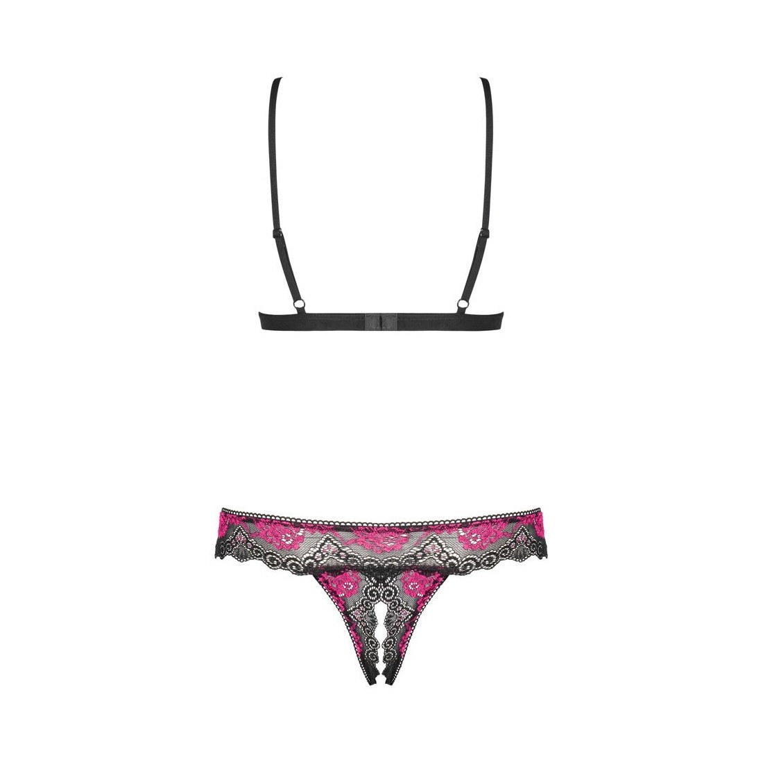 Set crotchless Tulia di Obsessive con reggiseno e perizoma morbidi. Realizzato in bellissimo pizzo bicolore nero e rosa - morbido ed elastico su tutto il corpo per un elevato livello di comfort. Decorato con piccoli fiocchi tra le coppe aperte e sulla fascia in vita del perizoma. Le spalline del reggiseno e la chiusura a gancetto sulla schiena possono essere regolate per adattarsi.