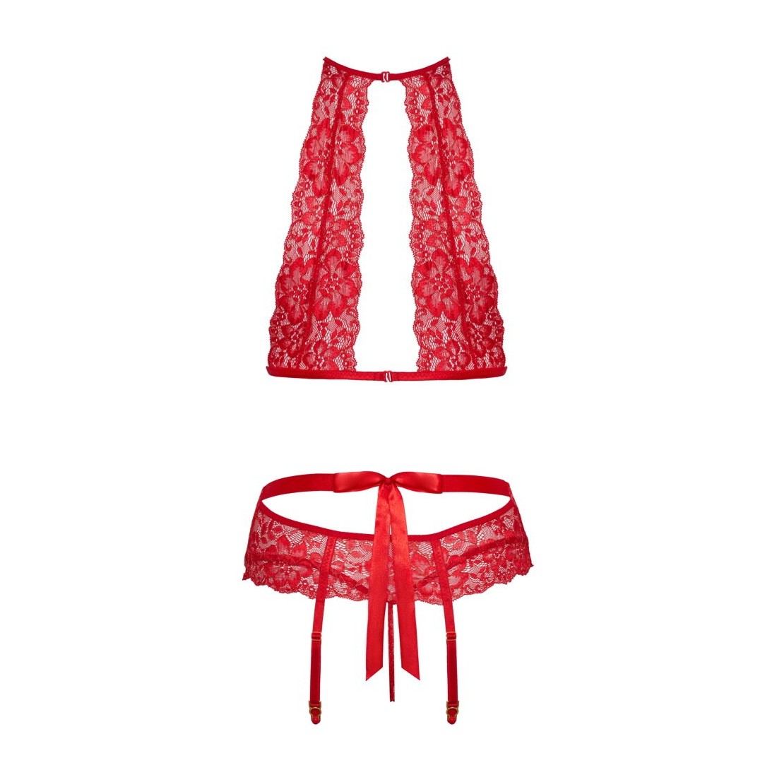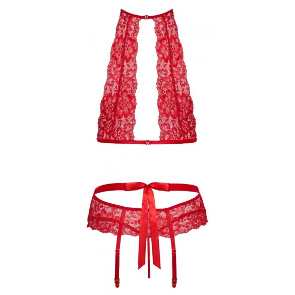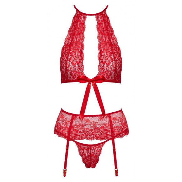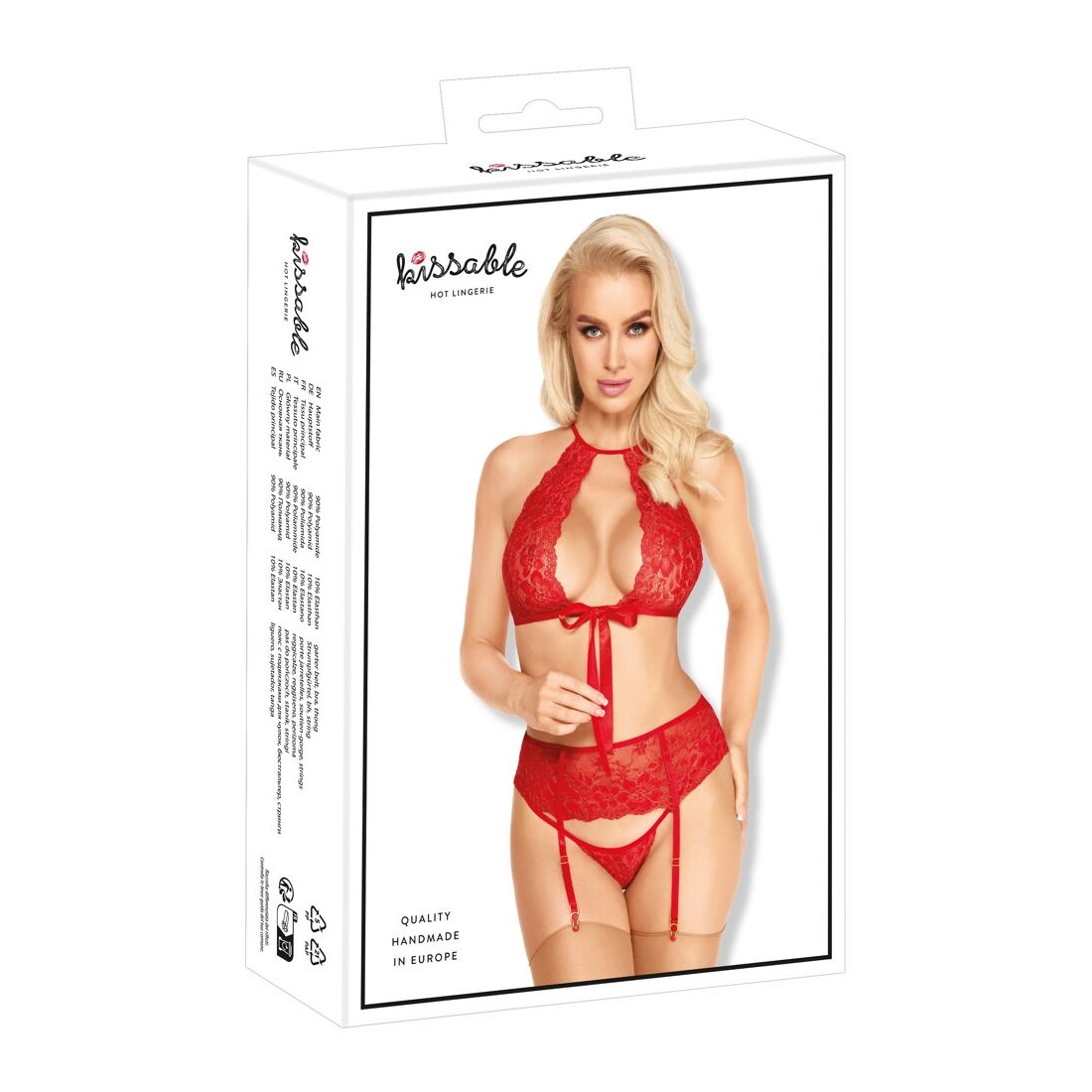 Morbido reggiseno, reggicalze e perizoma di kissable completamente realizzati in pregiato pizzo rosso con dettagli e riflessi dorati. Morbido ed elastico su tutto il corpo per il massimo comfort. Reggiseno elegante sul davanti con fiocco in raso, chiusura a gancetto sul collo e sulla schiena. Reggicalze sul retro con fiocco in raso, bretelle regolabili. Il piccolo perizoma in pizzo seduce con due strette fasce elastiche che si uniscono all'inguine.