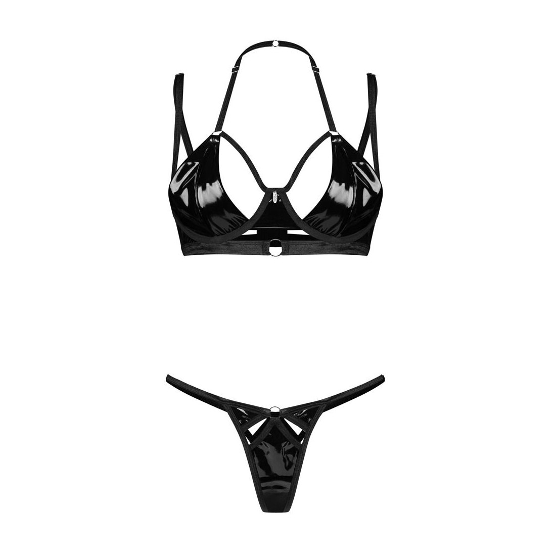 Set in vinile Keira Lise di Obsessive con reggiseno e perizoma. Stile seducente in vinile nero lucido con anelli argentati e tagli eccitanti. Morbido ed elastico per un elevato comfort di utilizzo. Reggiseno in vinile con stravaganti spalline elastiche e sottili dettagli gioiello tra le coppe. Le spalline e la chiusura a gancetto sulla schiena possono essere regolate per adattarsi. Il perizoma in vinile elaborato completa il sensazionale look lucido.