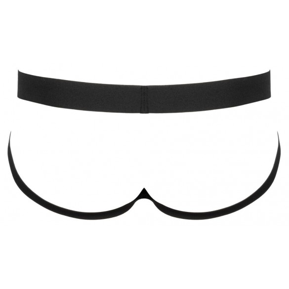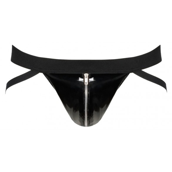 Jock in vernice nera di Black Level con ampia e comoda fascia elastica intrecciata in vita e comode spalline elastiche intrecciate. In una custodia in vinile con cerniera argentata.