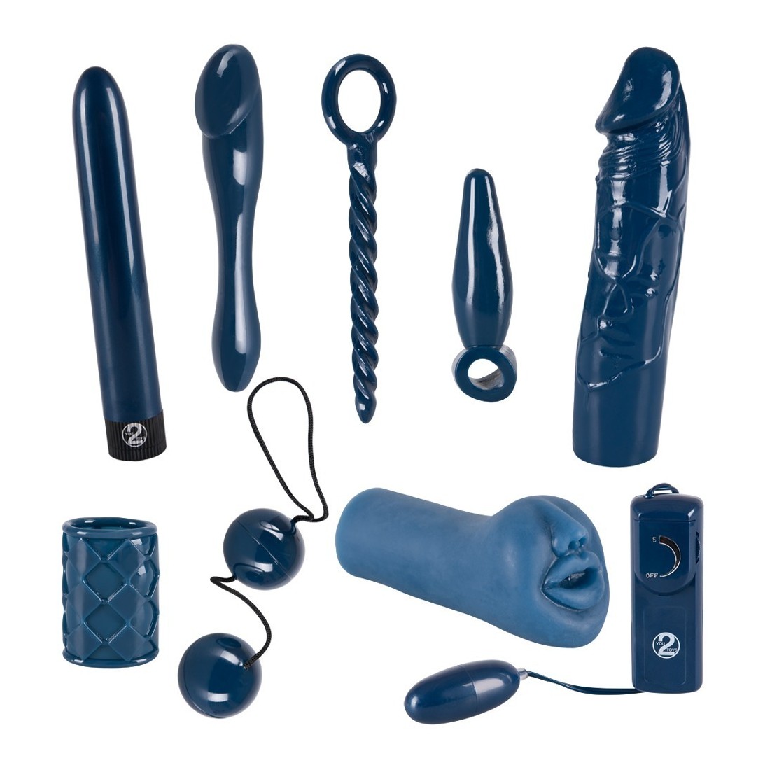 Set super-sesso per „ore blu“ piene di raffinate stimolazione! 9 pezzi eccitanti che animano l‘instinto per il gioco e alimentano la fantasia erotica: Vibratore (17,5 cm, Ø 2,5 cm), guaina del piacere per il pene oppure vibratore, dildo doppio, plug anale a forma di dito, sfere del piacere, manicotto per pene, masturbatore Blow-job per un folle momento di sesso da soli, uovo vibrante, barra anale. Materiale: ABS, PVC, TPE. Incluse batterie.