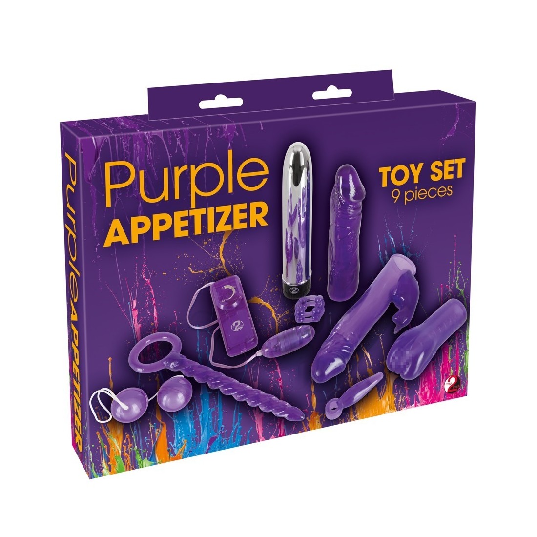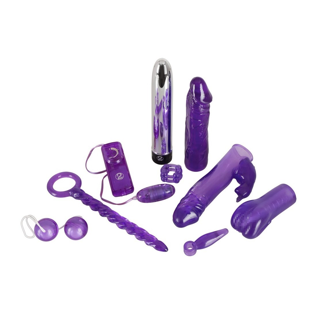 Contenuto: 1 bastone anale a spirale (ca. 23 cm di lunghezza, Ø 1,6 cm), 1 vibratore color argento (ca. 19 cm di lunghezza, Ø 3,3 cm), 1 copripene per vibratore con stimolatore del clitoride, 1 dildo, 1 masturbatore a forma di vagina, 1 uovo vibro su cavo con telecomando, 1 piolo anale con passante per dita, 1 paio di palle d'amore, 1 anello per il pene. Materiale: TPE, ABS. Batterie incluse.