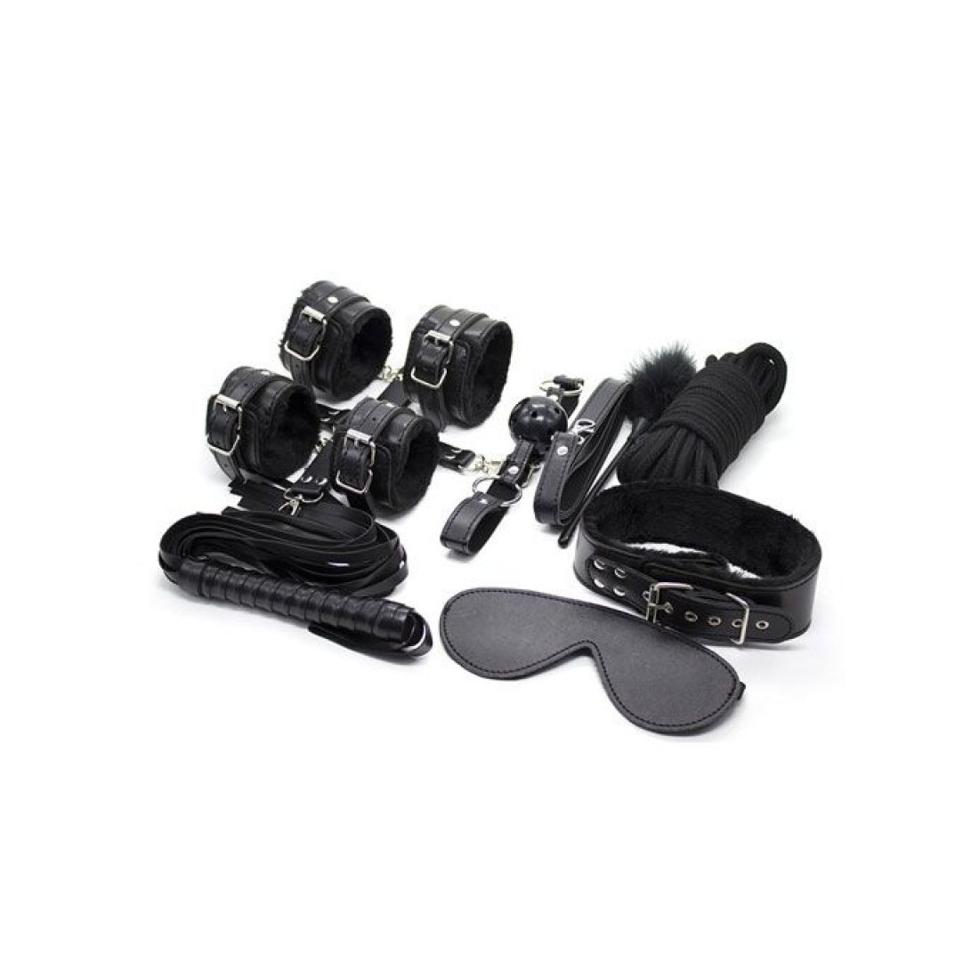 Questo kit contiene tutto quanto un fanatico del fetish possa desiderare: manette per polsi e caviglie collare pinze per capezzoli benda frusta e bavaglio con morso a forma di pallina. Il kit composto da molti pezzi per cui si presta a varie combinazioni e tipi di utilizzo. La benda soffice.