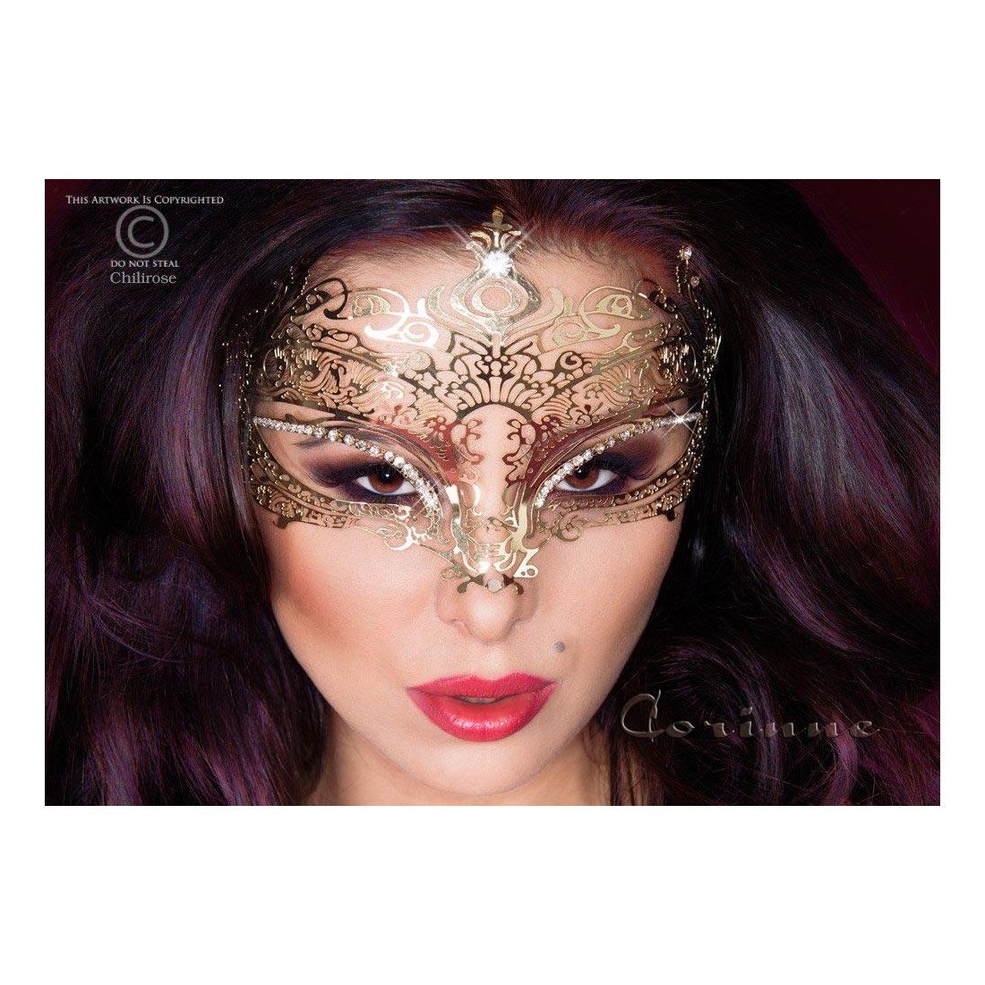Originale maschera dorata metallica filigranata, anatomica e flessibile, impreziosita da numerose applicazioni di strass. Legatura mediante fettucce nere in raso.
