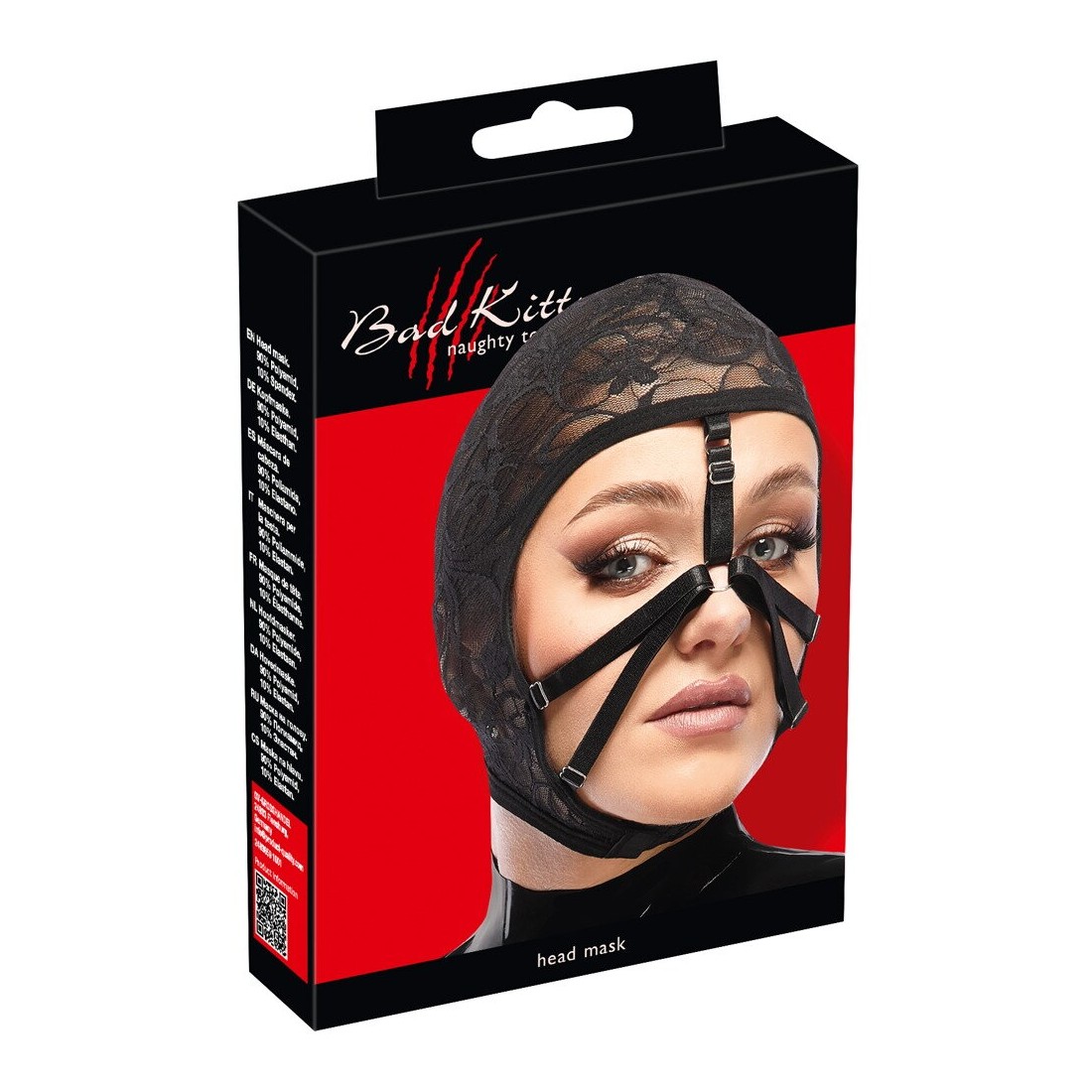 Maschera nera per la testa di Bad Kitty realizzata in fine pizzo elasticizzato. Si adatta dolcemente alla testa e si adatta perfettamente per un elevato livello di comfort. Con strette cinghie regolabili nell'area del viso aperto per un look bizzarro.