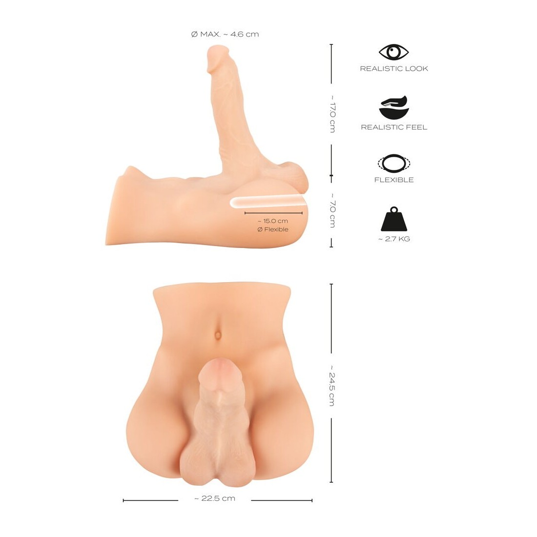 Masturbatore con busto sagomato realistico Deluxe Man 02 di realistixxx con uno splendido pene flessibile (dildo), testicoli sodi e apertura dell'ano dettagliata. Per un'intensa esperienza anale, il canale del piacere stretto ed elastico è strutturato all'interno con nodi e scanalature.