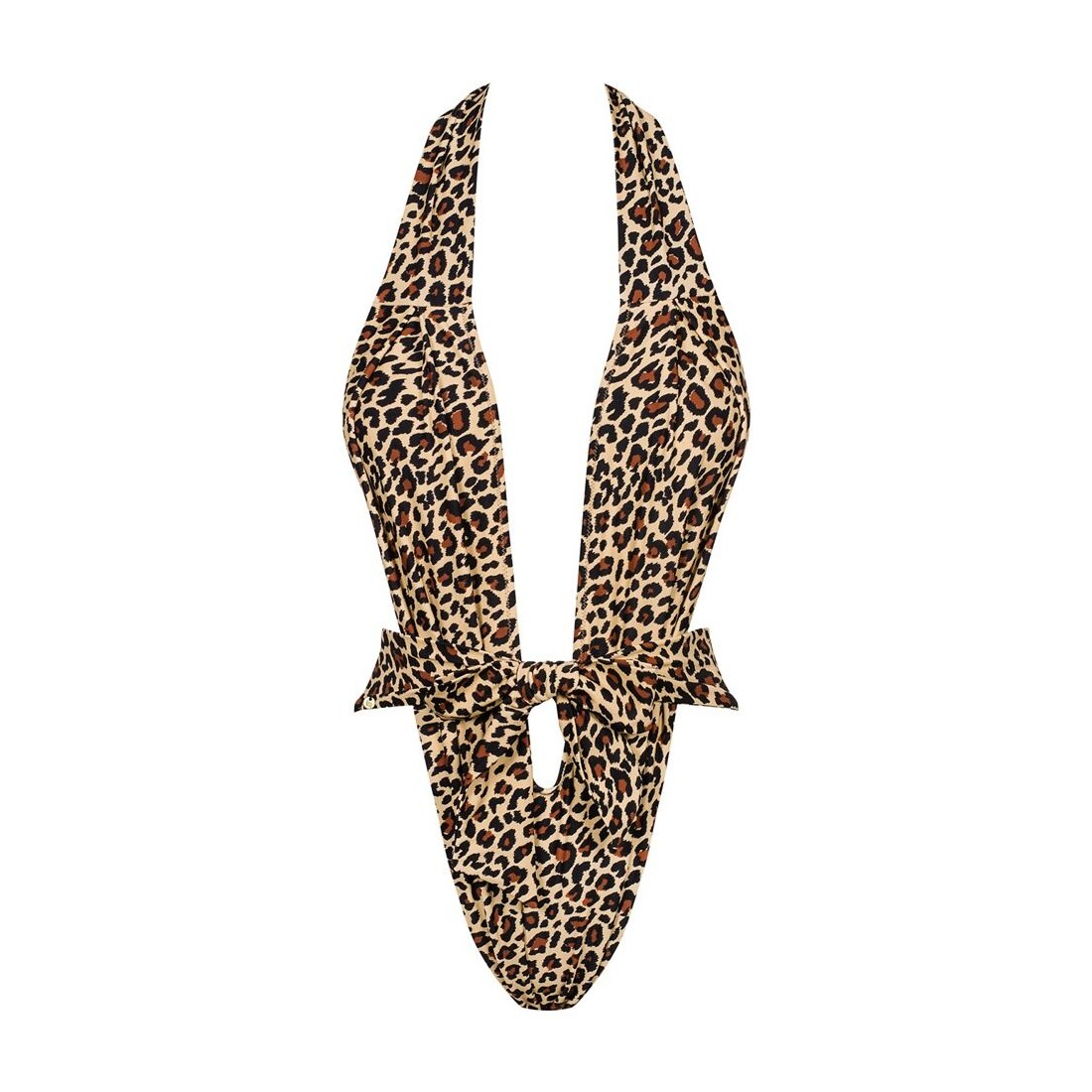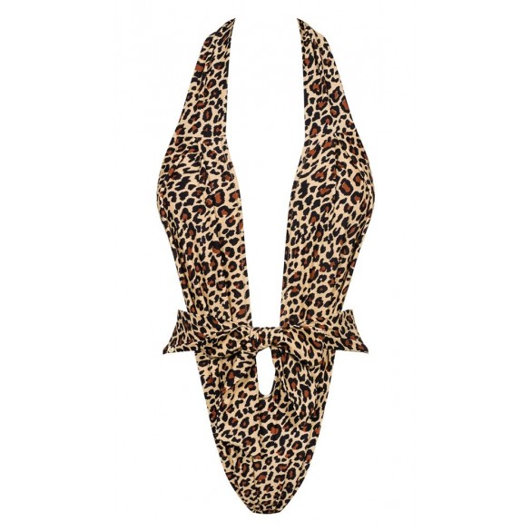 Costume da bagno Cancunella leopardato con taglio basso sul davanti fino all'ombelico e legato in vita. unica