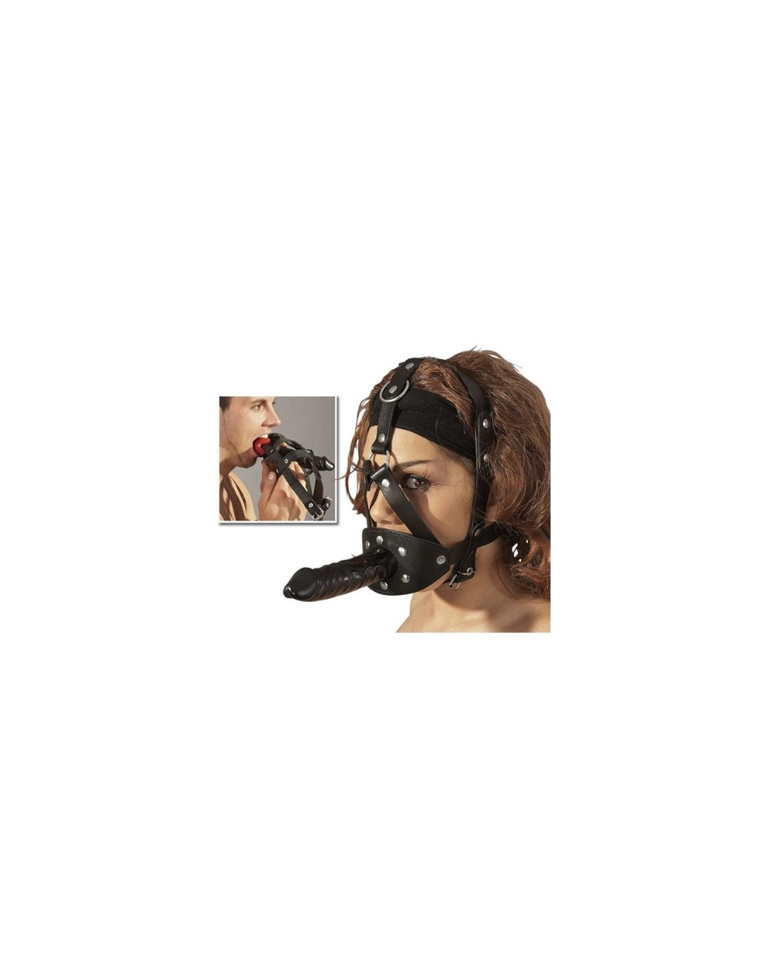 Fetish sadomaso per giochi di ruolo BDSM Maschera per la testa costituita da cinghie in pelle nera regolabili con fibbie.interno per la bocca di chi la indossa e dildo nero naturale verso l'esterno.Materiale del dildo:LatexLunghezza del dildo: 16 cm circa diametro 3.5 Diametro gag per la bocca 3.5.