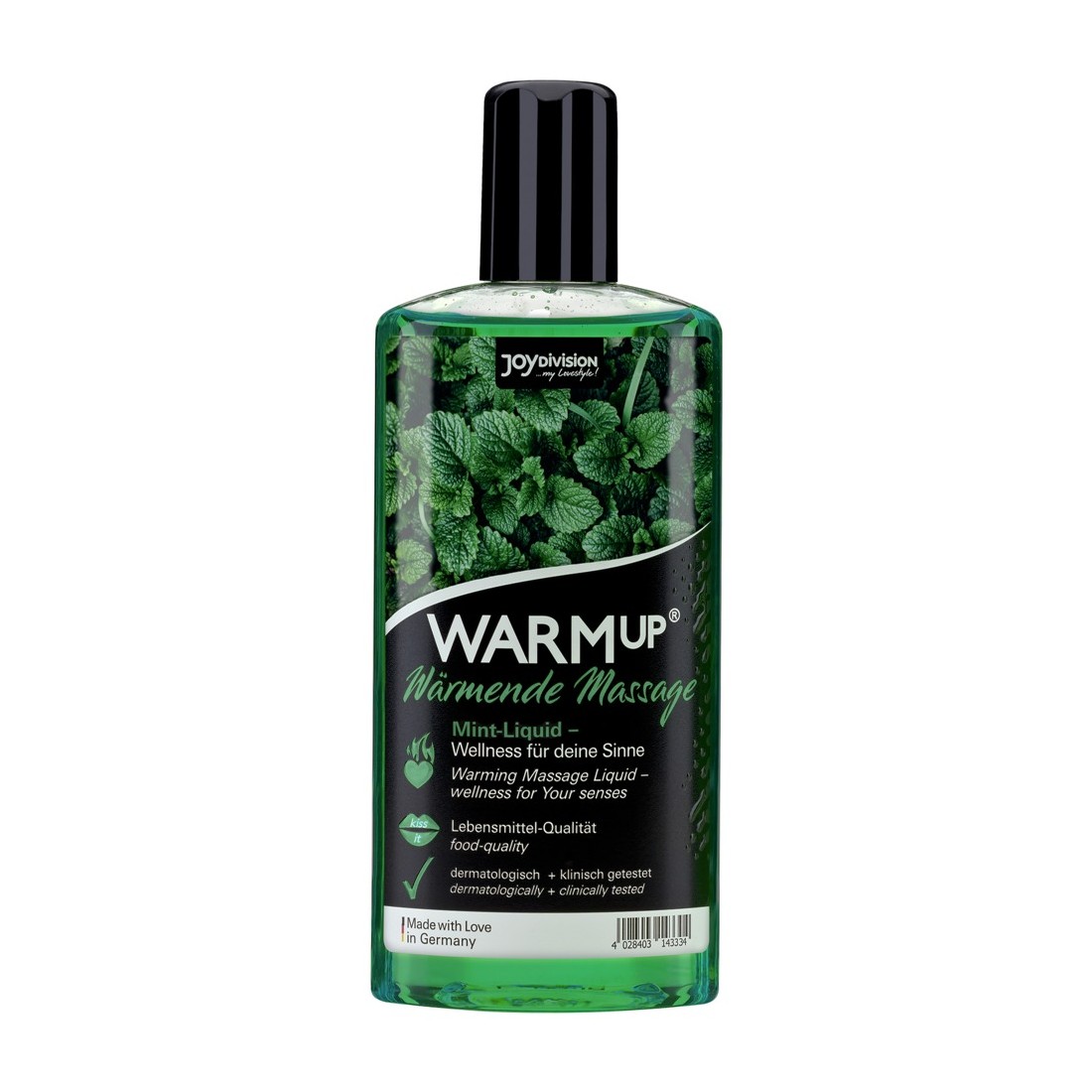 Massaggio liquido WARMup di Joydivision con un piacevole effetto riscaldante e un seducente aroma e profumo di menta. Dermatologicamente e clinicamente testato. Qualità alimentare senza zucchero e senza olio. Solubile in acqua - facile da lavare via.