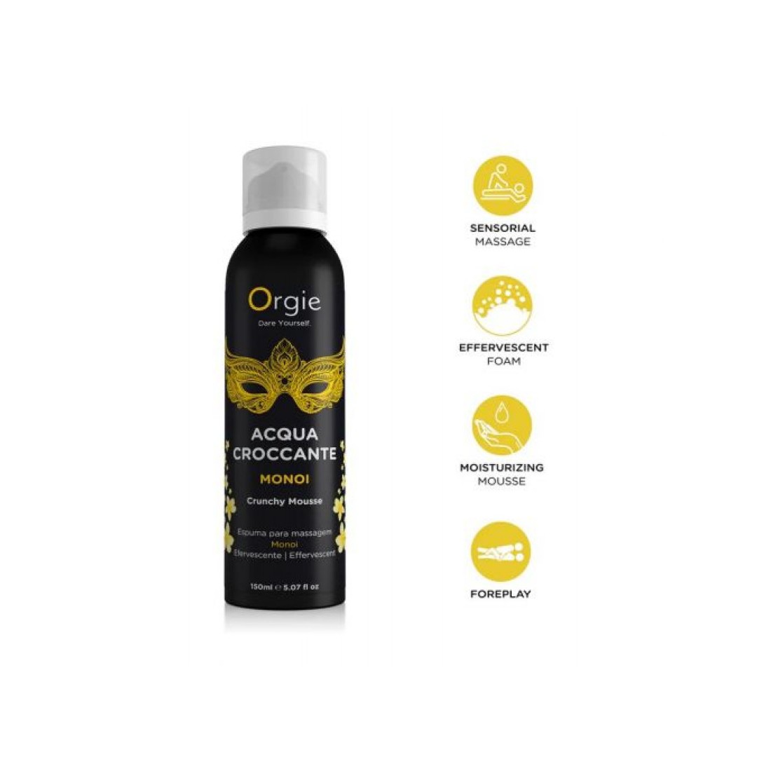 Schiuma Croccante Monoi è una mousse effervescente ed idratante che renderà i preliminari ancora più caldi ed eccitanti. La sua deliziosa fragranza al Monoi inebria i sensi e guida in un esotico viaggio all’insegna del piacere. Sarà finalmente possibile sedurre il/la partner con massaggi sensuali ed erotici e dare via a momenti unici e pieni di passione. Prodotto clinicamente e dermatologicamente testato. Pratico formato da 150 ml con dosatore. Tenere il prodotto fuori dalla portata dei bambini e conservarlo in un luogo fresco ed asciutto. Si consiglia di non applicare il prodotto sulla pelle irritata o lesa e di sciacquare abbondantemente con acqua in caso di irritazione o contatto con gli occhi. Non ingerire. Solo per uso esterno.