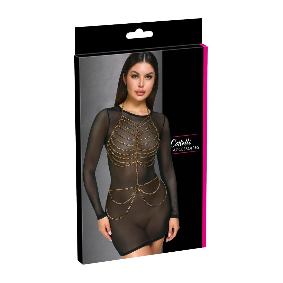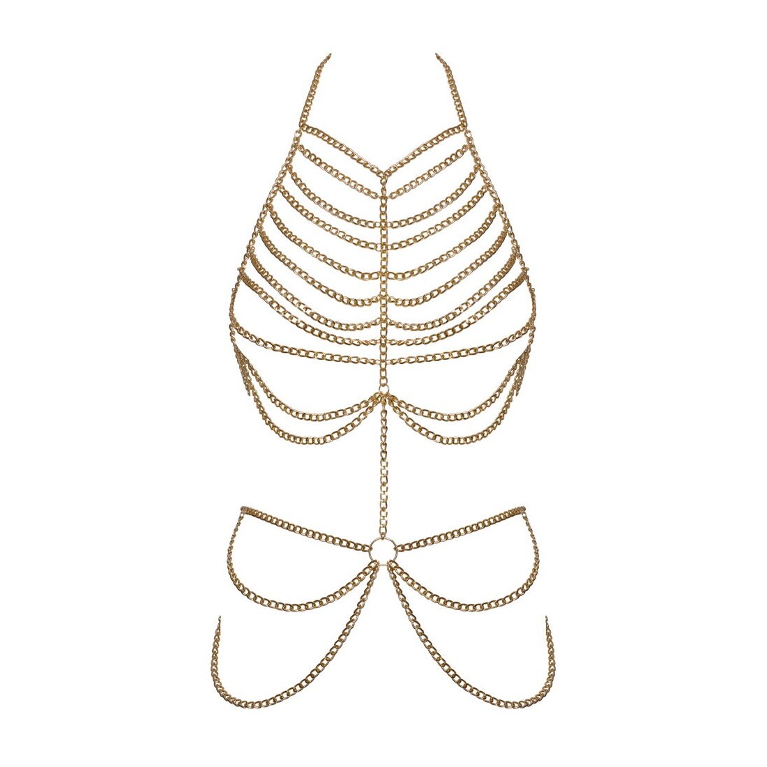 Catena per il corpo color oro di Cottelli ACCESSOIRES in un look a due pezzi. Con sontuosi bordi a catena sul seno e sui fianchi nella parte anteriore. Regolabile e personalizzabile individualmente sul collo e sulla schiena aperta con un totale di 3 chiusure a moschettone. Indossati da soli come lingerie per un look erotico o abbinati con stile a costumi da bagno e abiti aderenti, questi gioielli per il corpo glamour sono sempre un'attrazione per gli occhi!