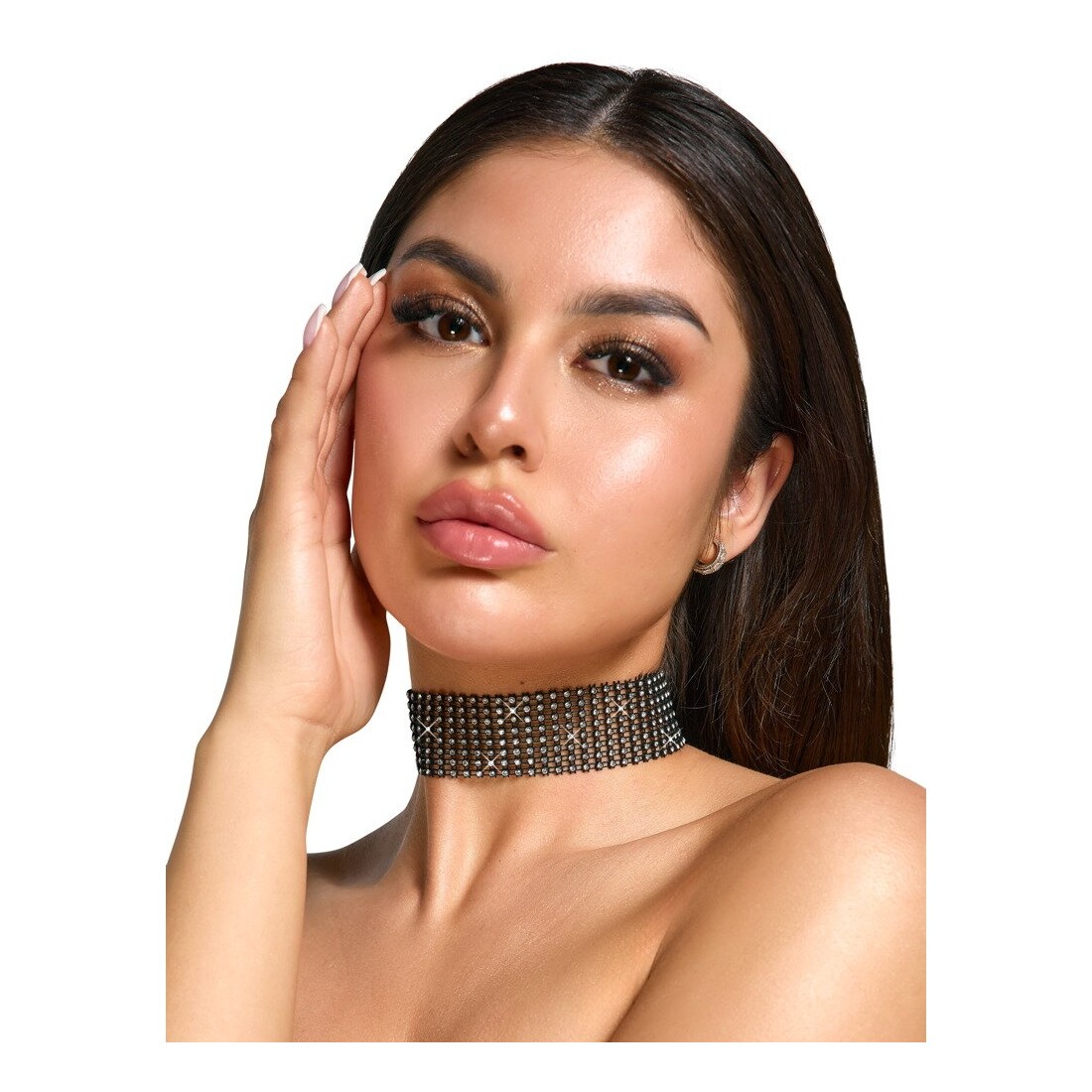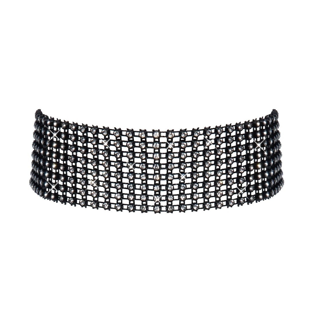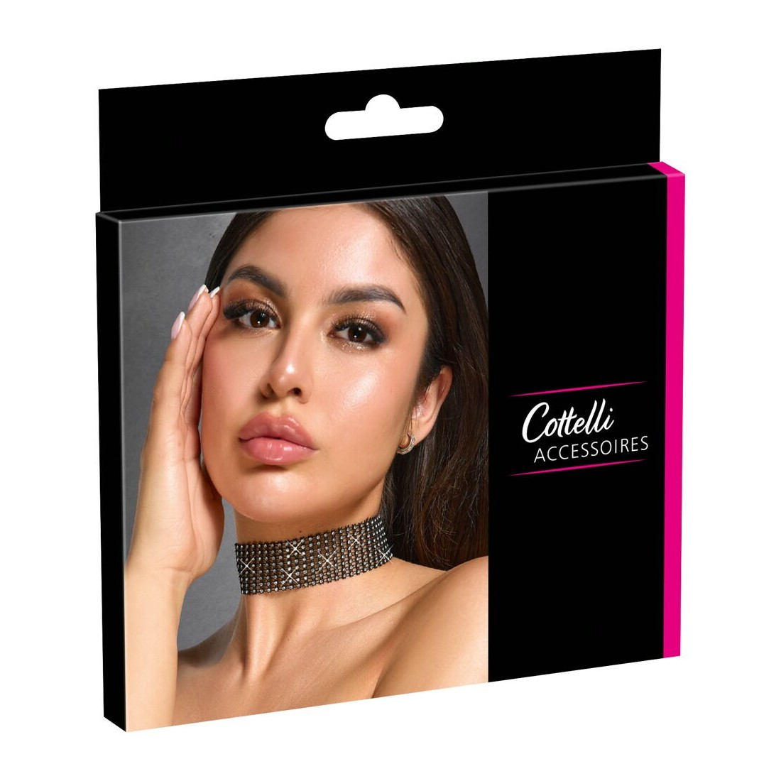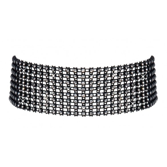 Girocollo nero cangiante di Cottelli ACCESSOIRES tempestato di innumerevoli strass. Larghezza/altezza di 3 cm. Con chiusura a moschettone regolabile sulla nuca.