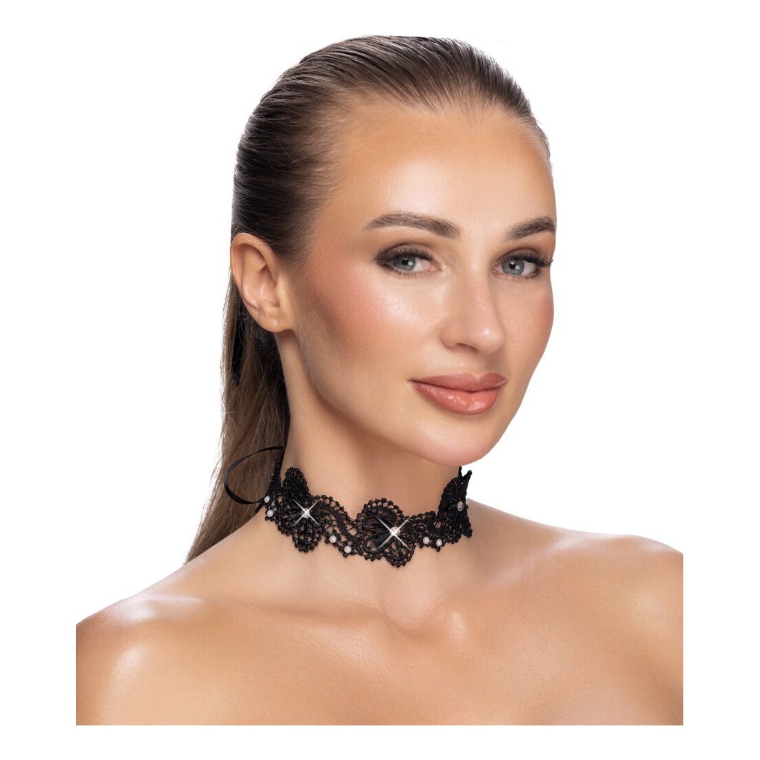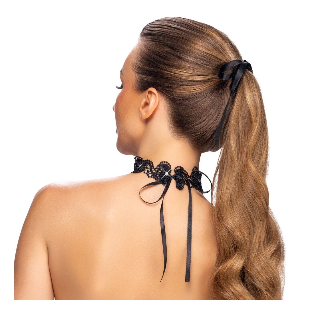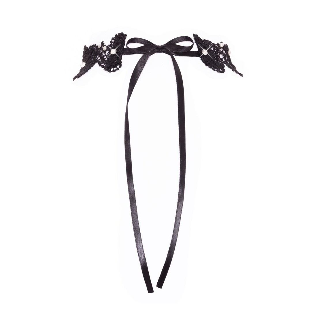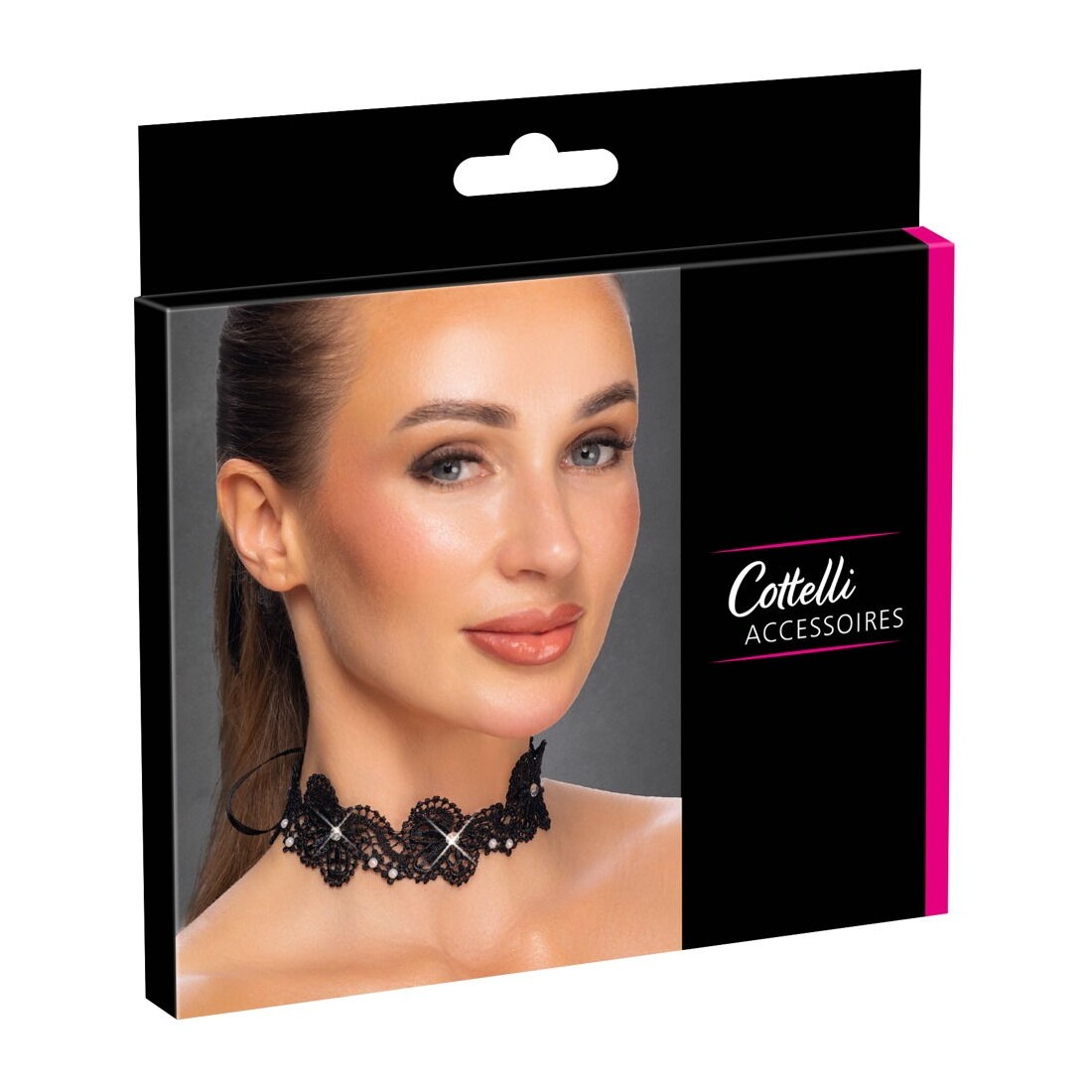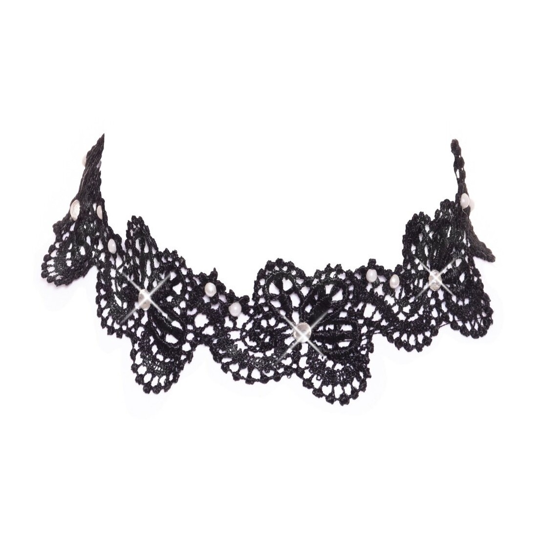 Collana nera di Cottelli ACCESSOIRES realizzata con un delicato ricamo in pizzo. Decorata con perle e strass luccicanti. Morbida e accogliente, larga/alta 3 cm. Laccio in raso regolabile individualmente sulla nuca.